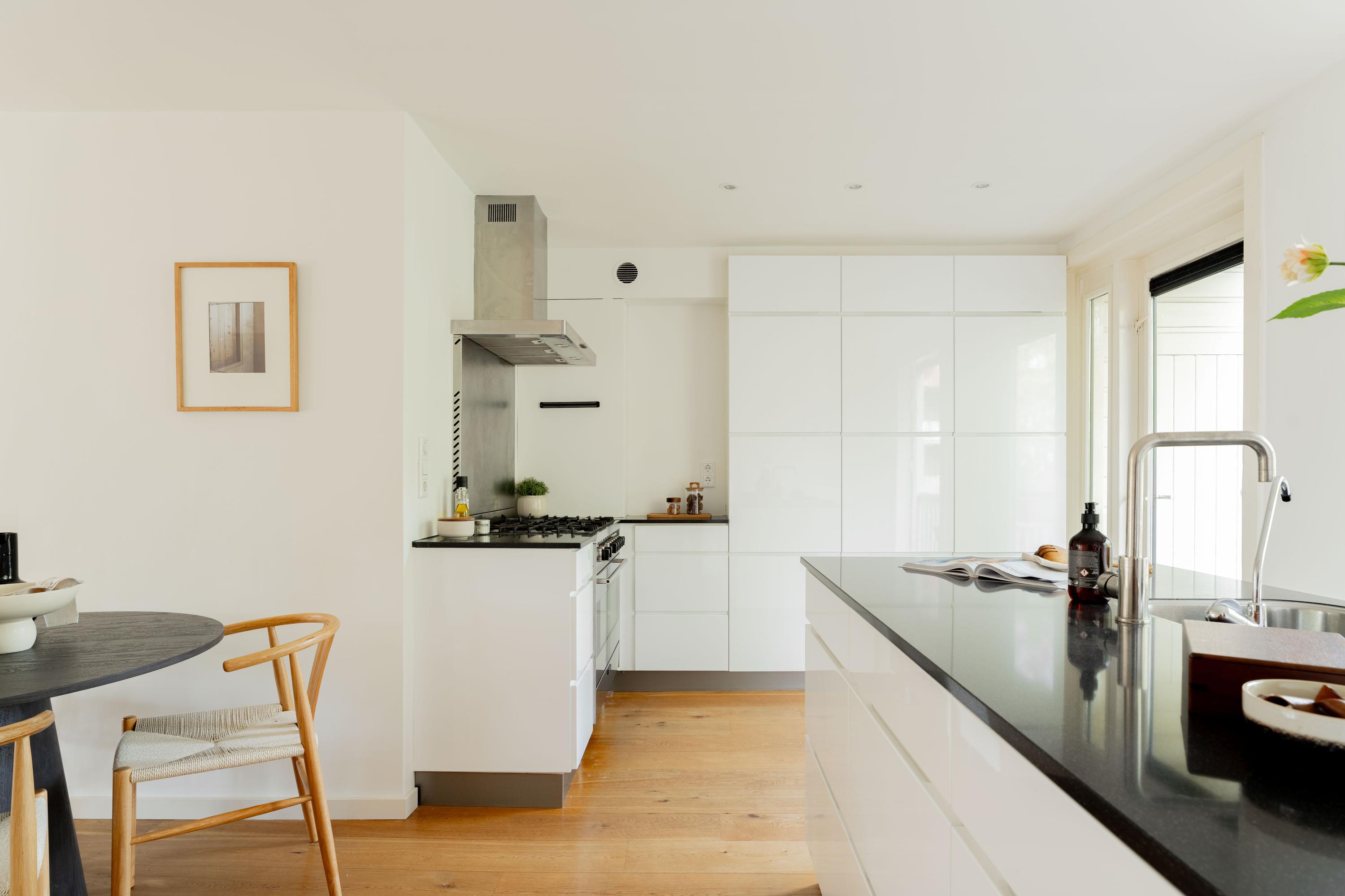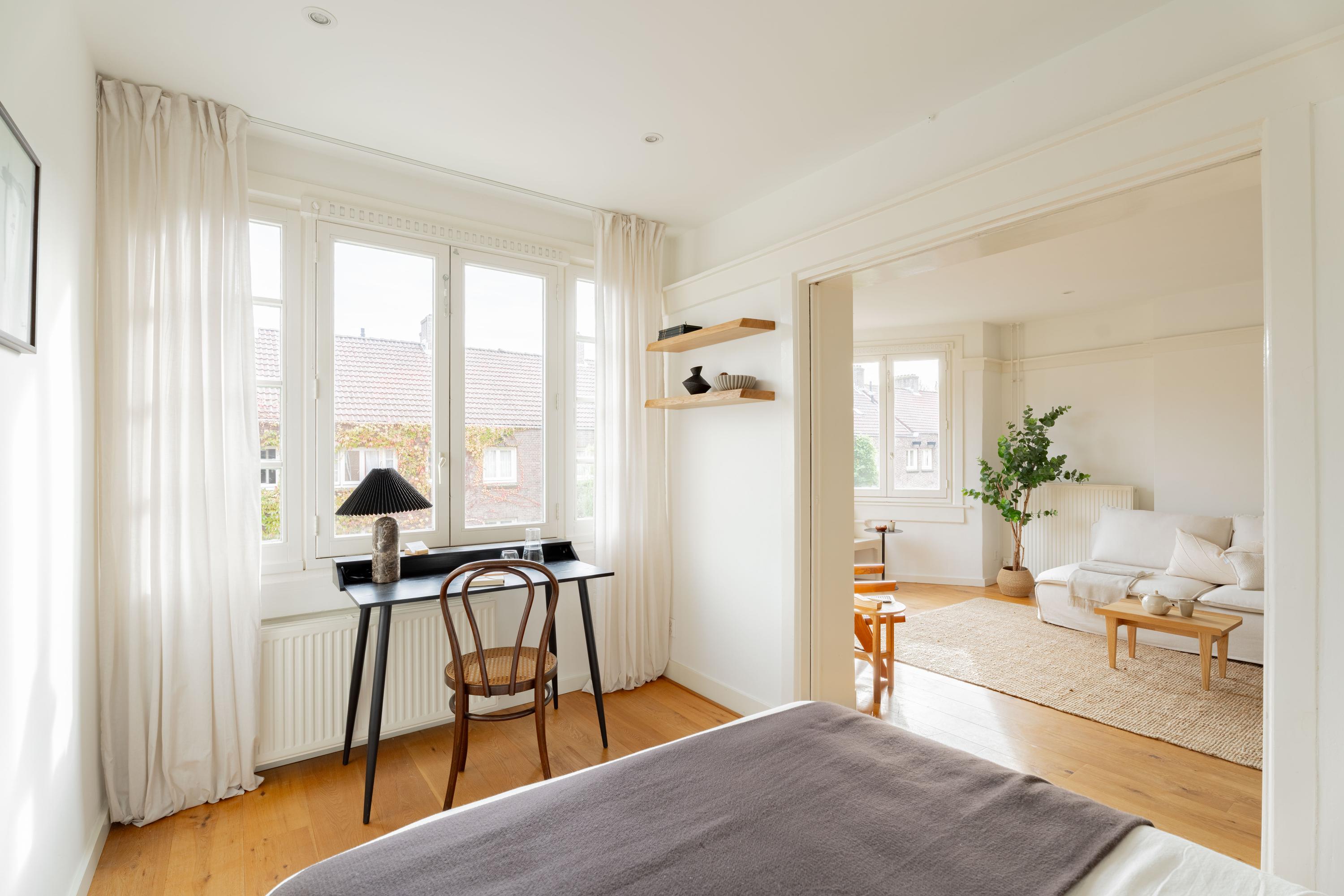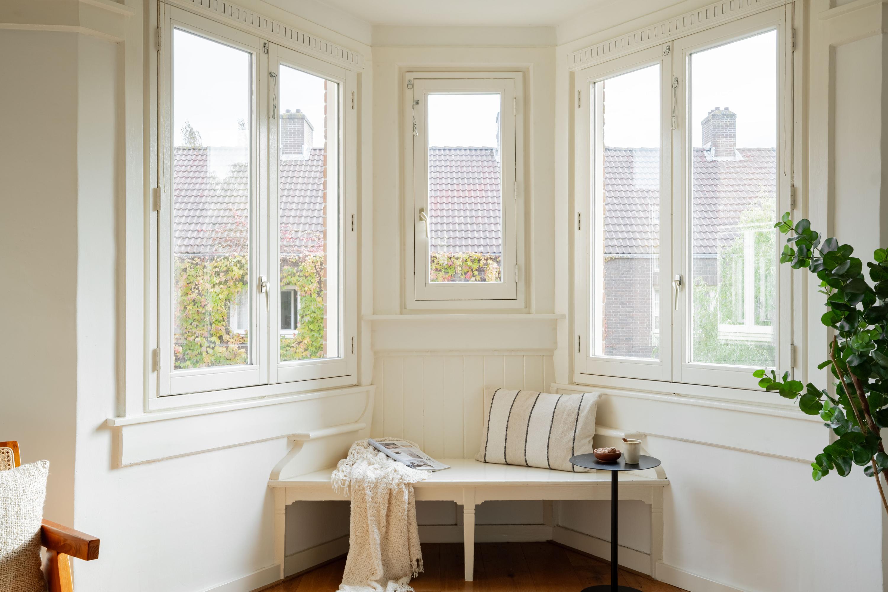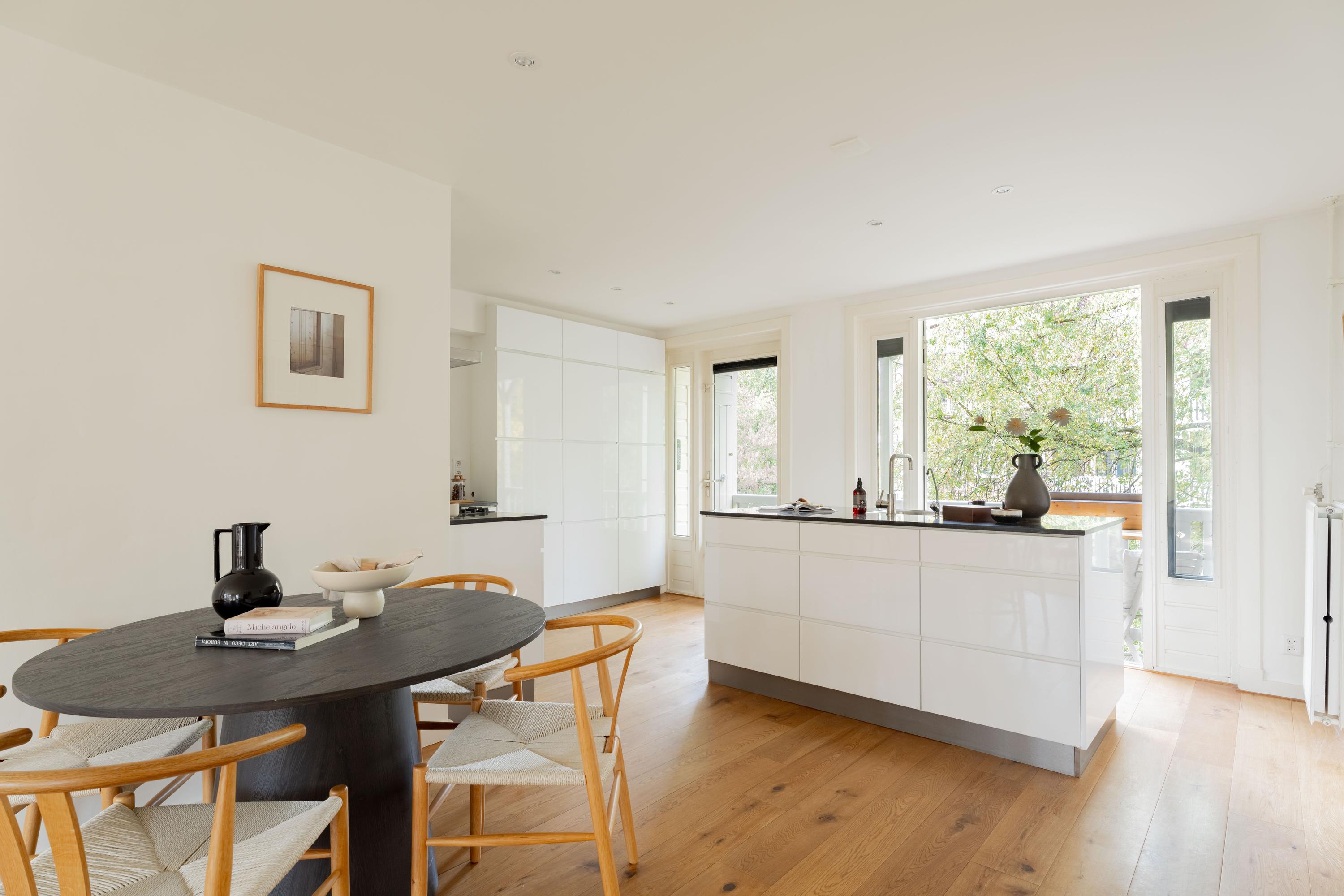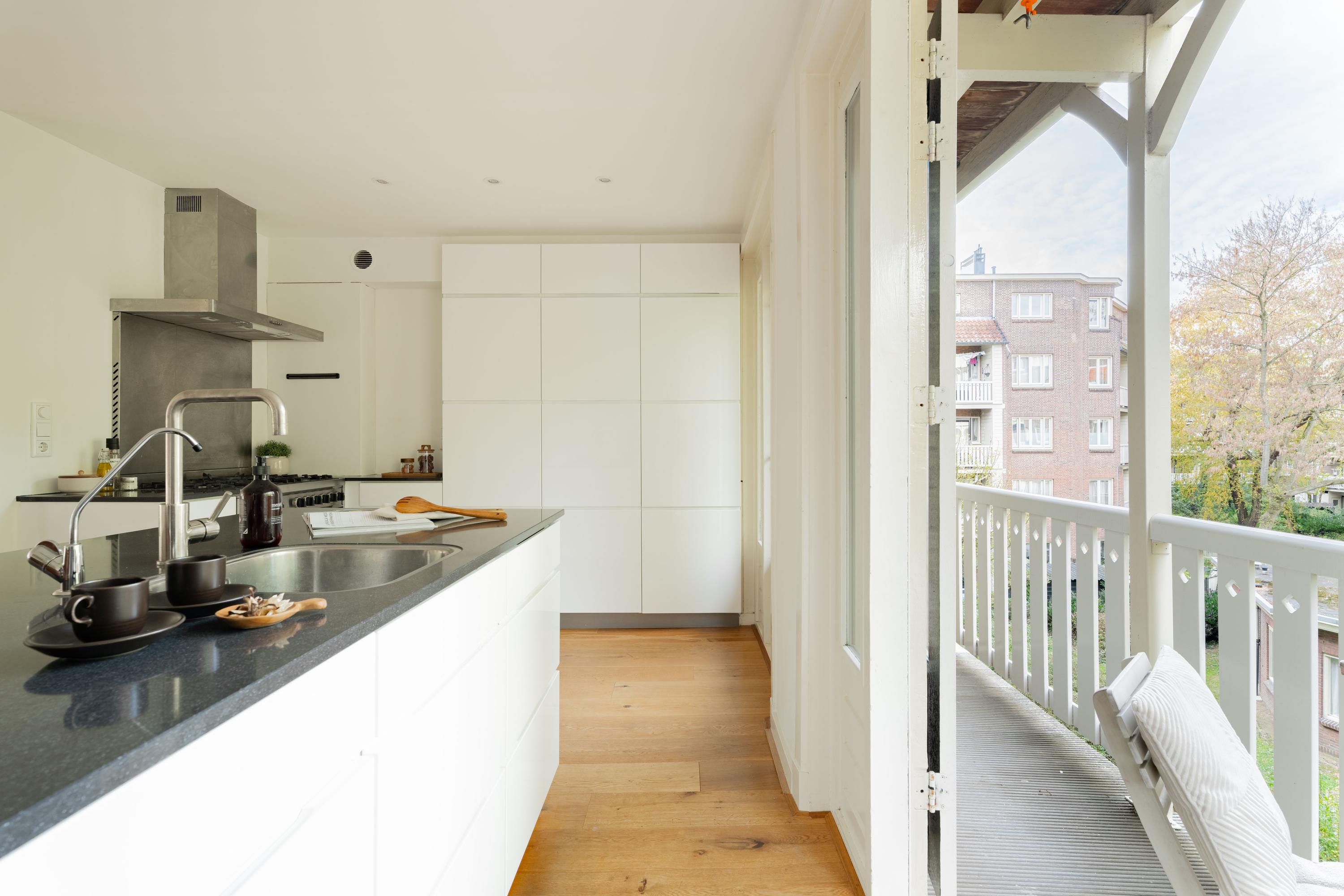De lichte woonkamer aan de voorzijde is voorzien van een sfeervolle erker die zorgt voor karakter, uitzicht en veel daglicht. Aan de achterzijde ligt de moderne open keuken, compleet met diverse inbouwapparatuur. Vanuit hier stap je via openslaande deuren het balkon op, waar je geniet van de middag- en avondzon met uitzicht over de groene binnentuinen. De woning beschikt over twee goed bemeten slaapkamers, waarvan de grootste eveneens toegang heeft tot het balkon. De moderne badkamer is uitgerust met een inloopdouche, dubbele wastafel en aansluiting voor de wasmachine. In de hal bevindt zich een separaat toilet. Op de zolderverdieping vind je nog een royale kamer van 11,8 m², ideaal als werkkamer, logeerruimte of atelier. Het pand is goed onderhouden en voorzien van houten kozijnen met dubbele beglazing.