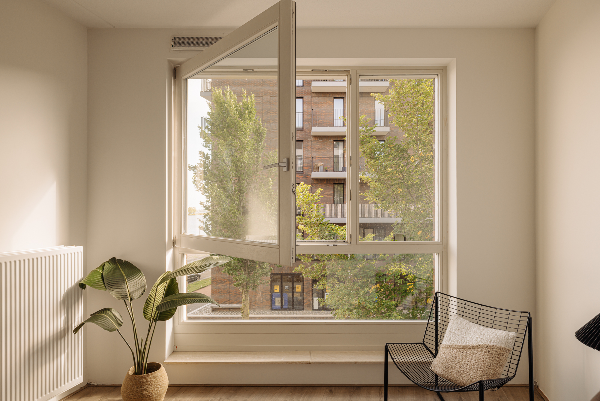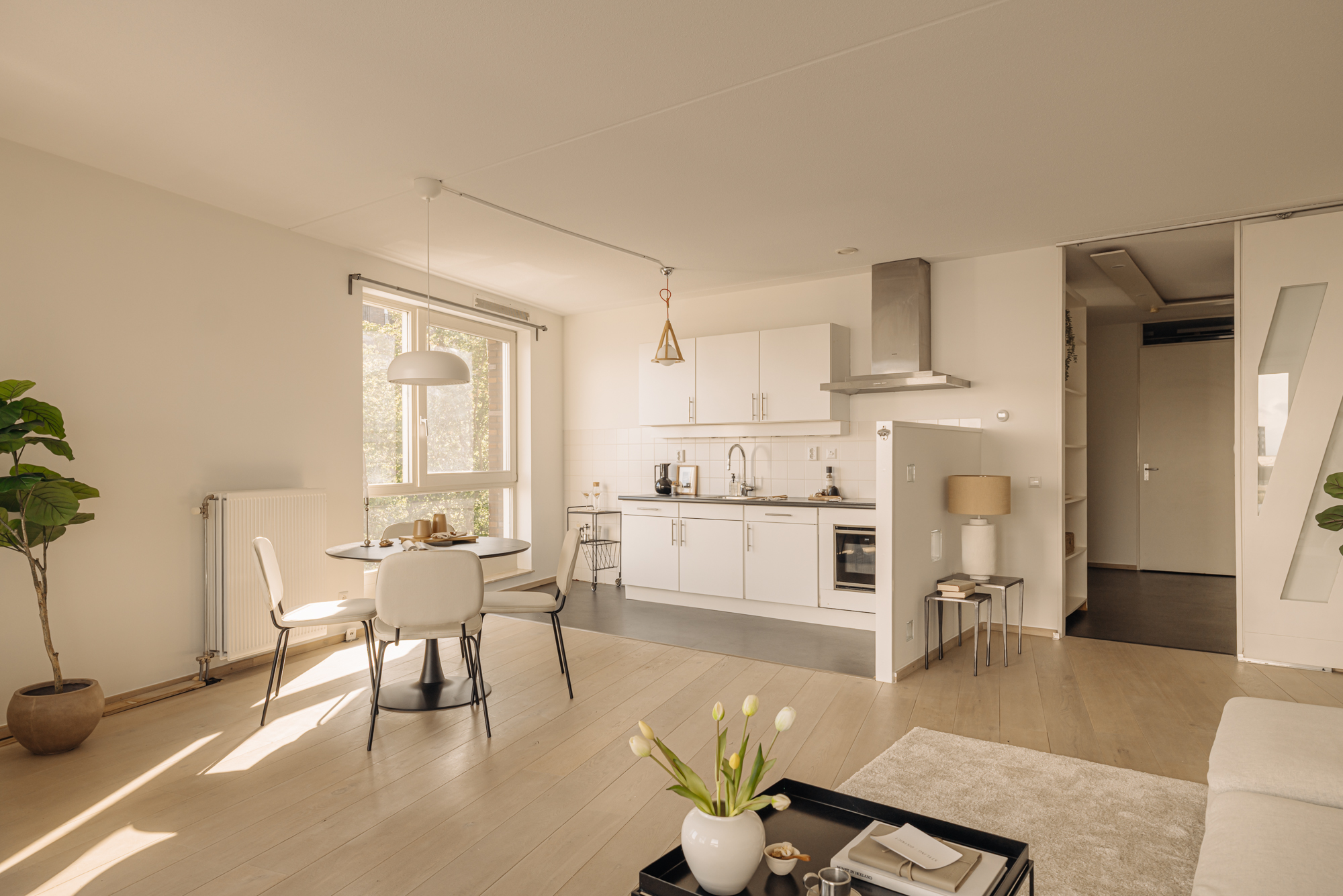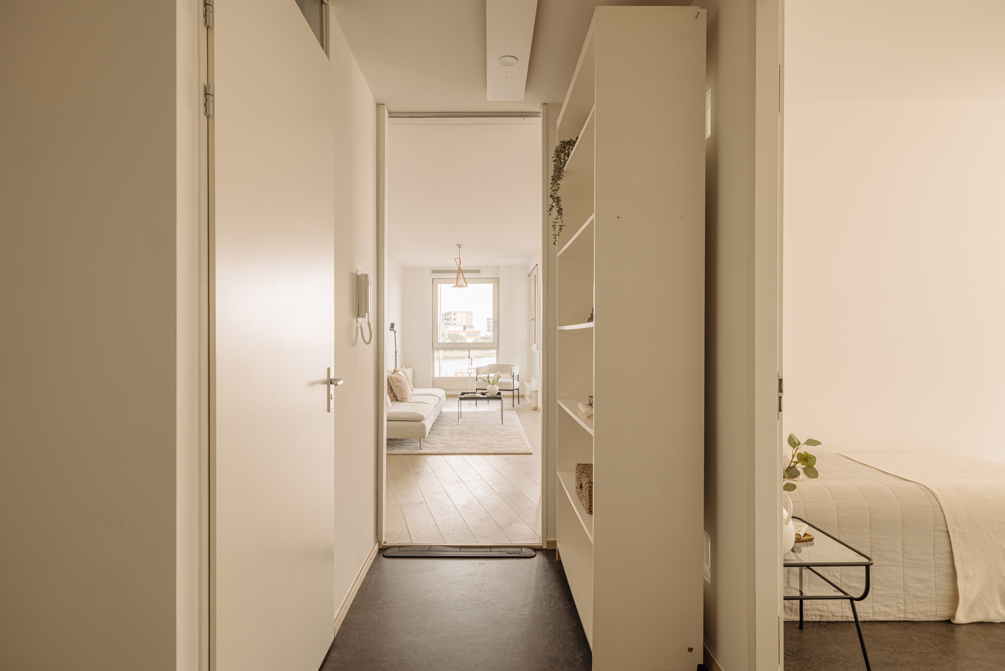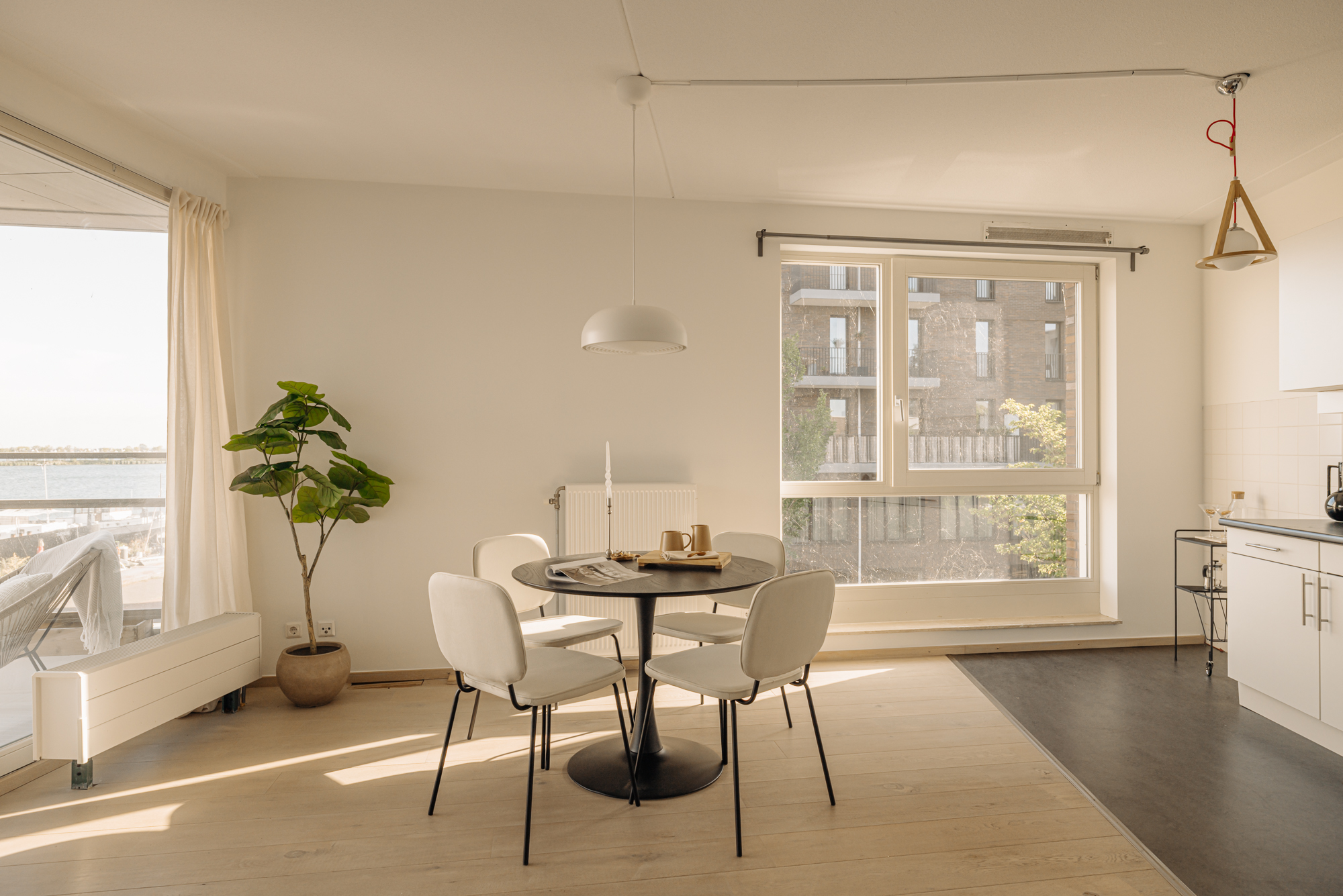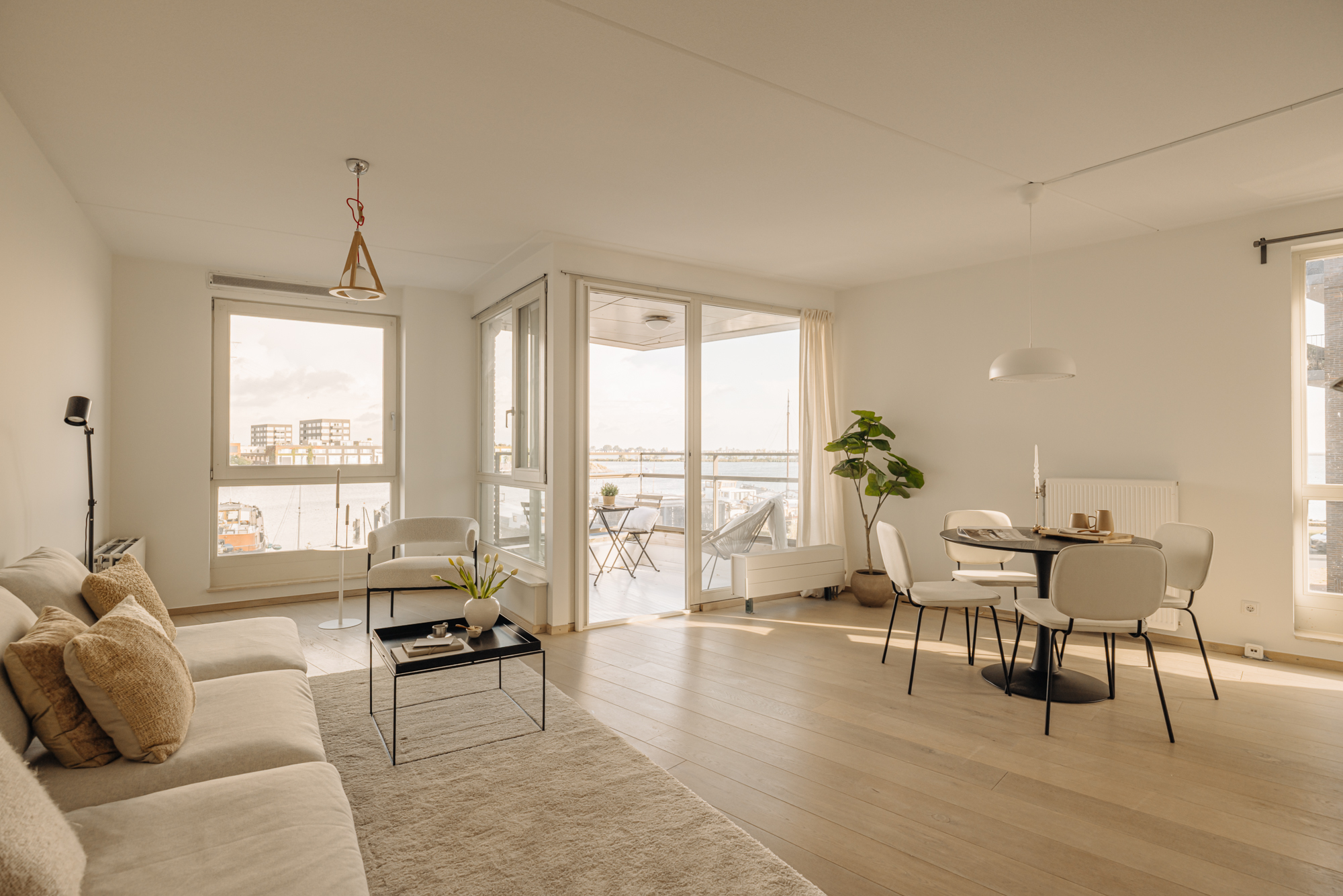 De woonkamer bevindt zich aan de voorzijde van het complex en profiteert dankzij de hoekligging en grote ramen van veel natuurlijk licht. Aansluitend vind je een ruim balkon op het westen, waar je kunt genieten van een prachtig uitzicht over de woonboten en het IJmeer. De zonsondergangen zijn hier werkelijk spectaculair. De open keuken grenst direct aan de woonkamer en is uitgerust met een inductiekookplaat en een combi-oven. De gehele woonruimte is afgewerkt met een lichte lamelparketvloer.