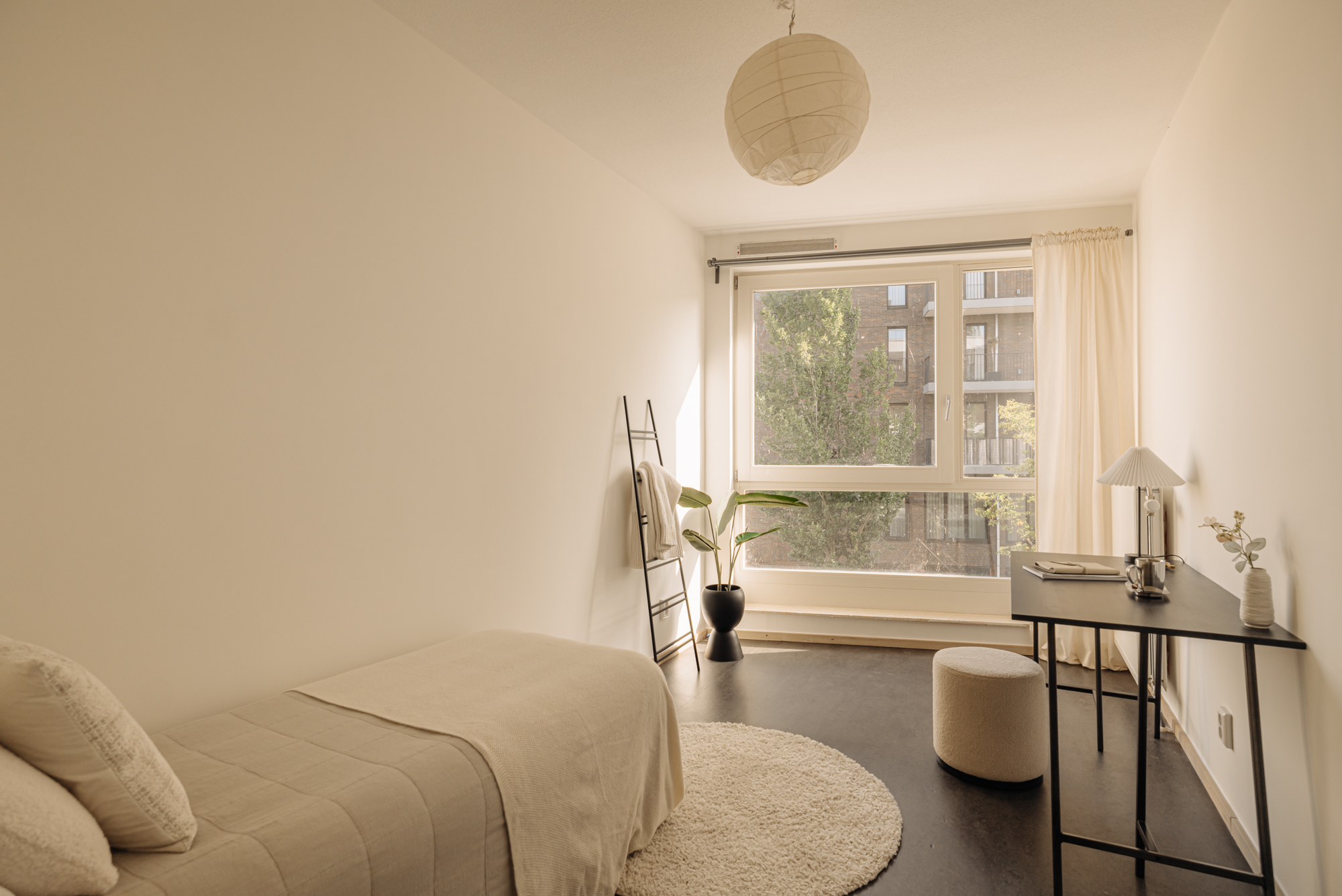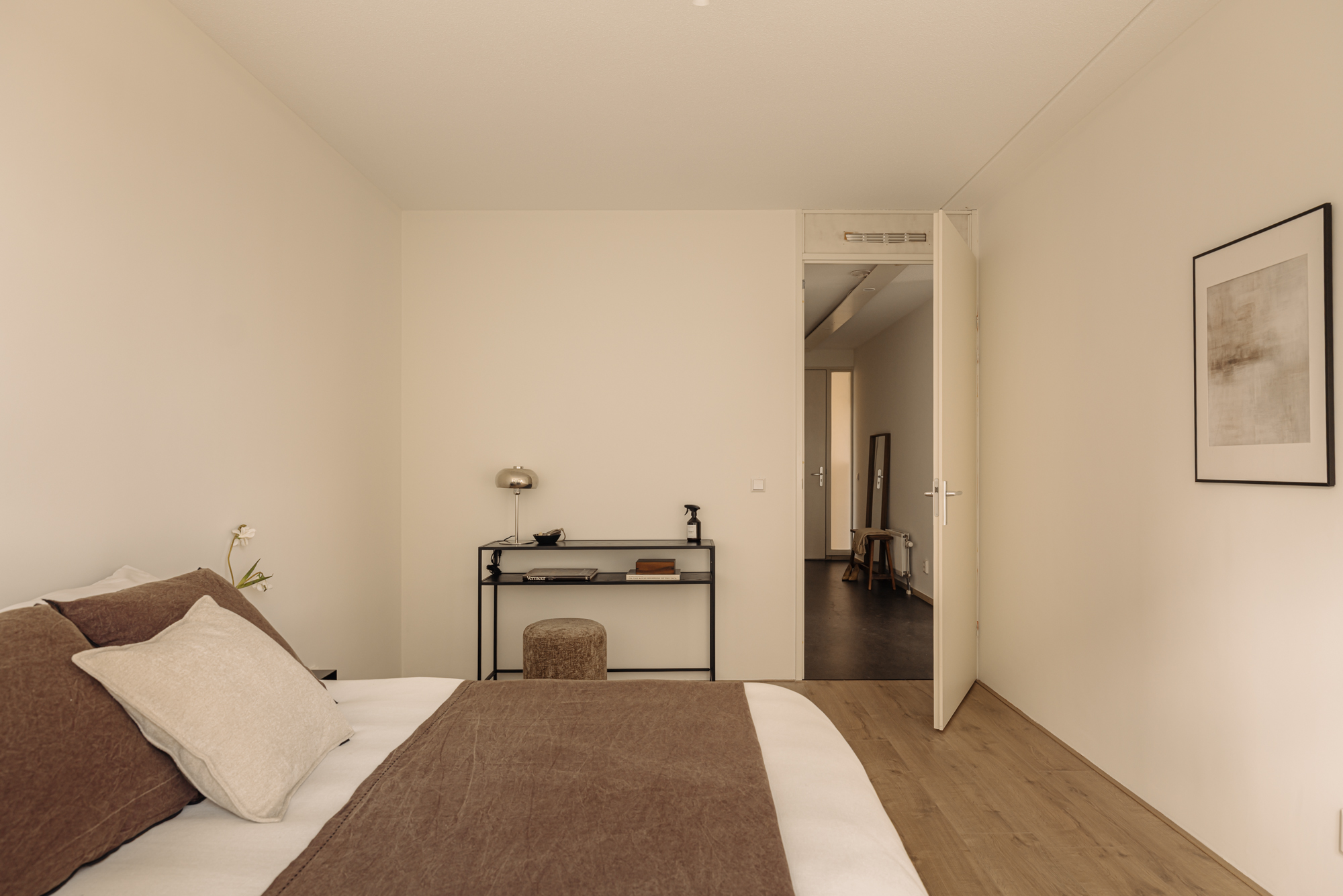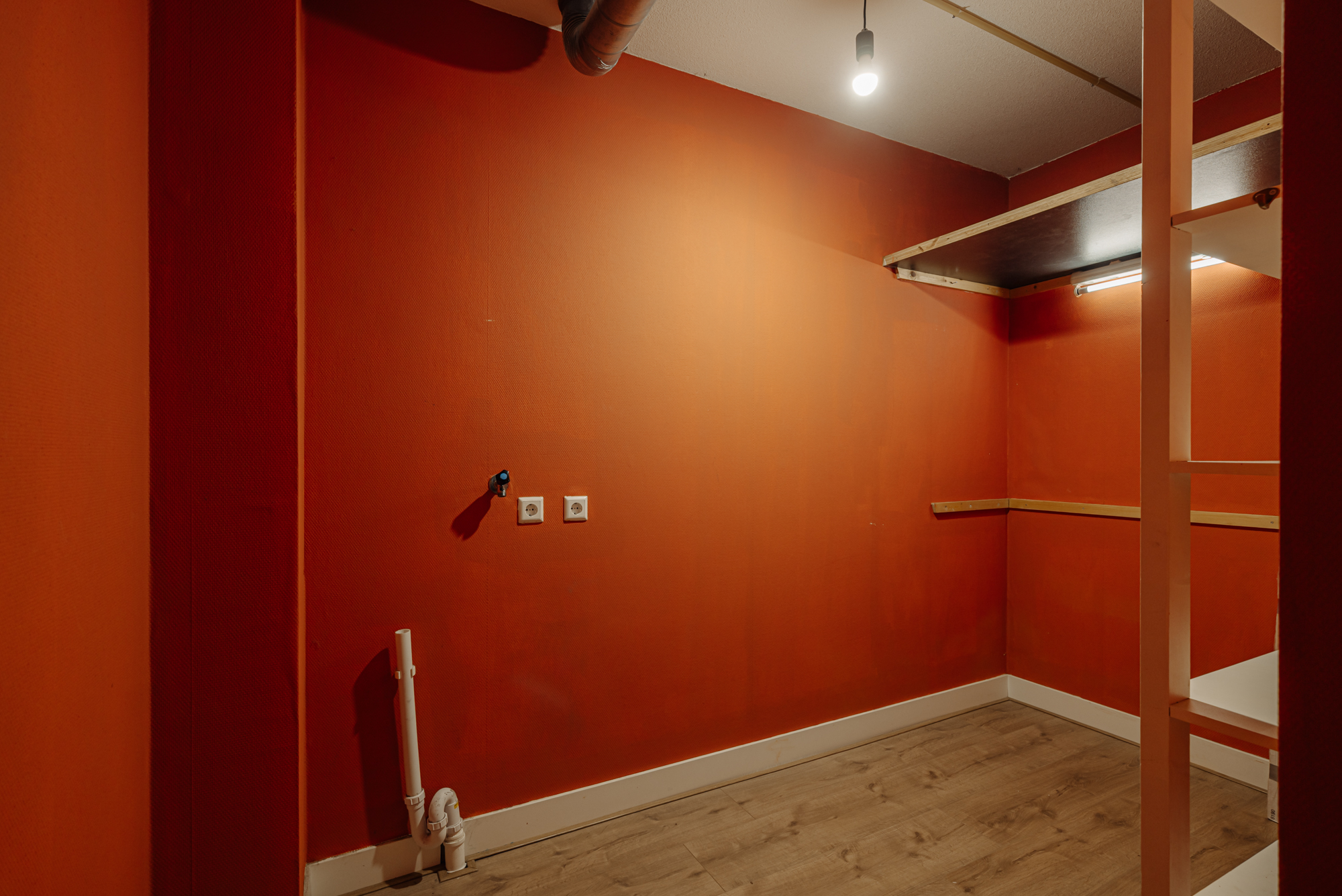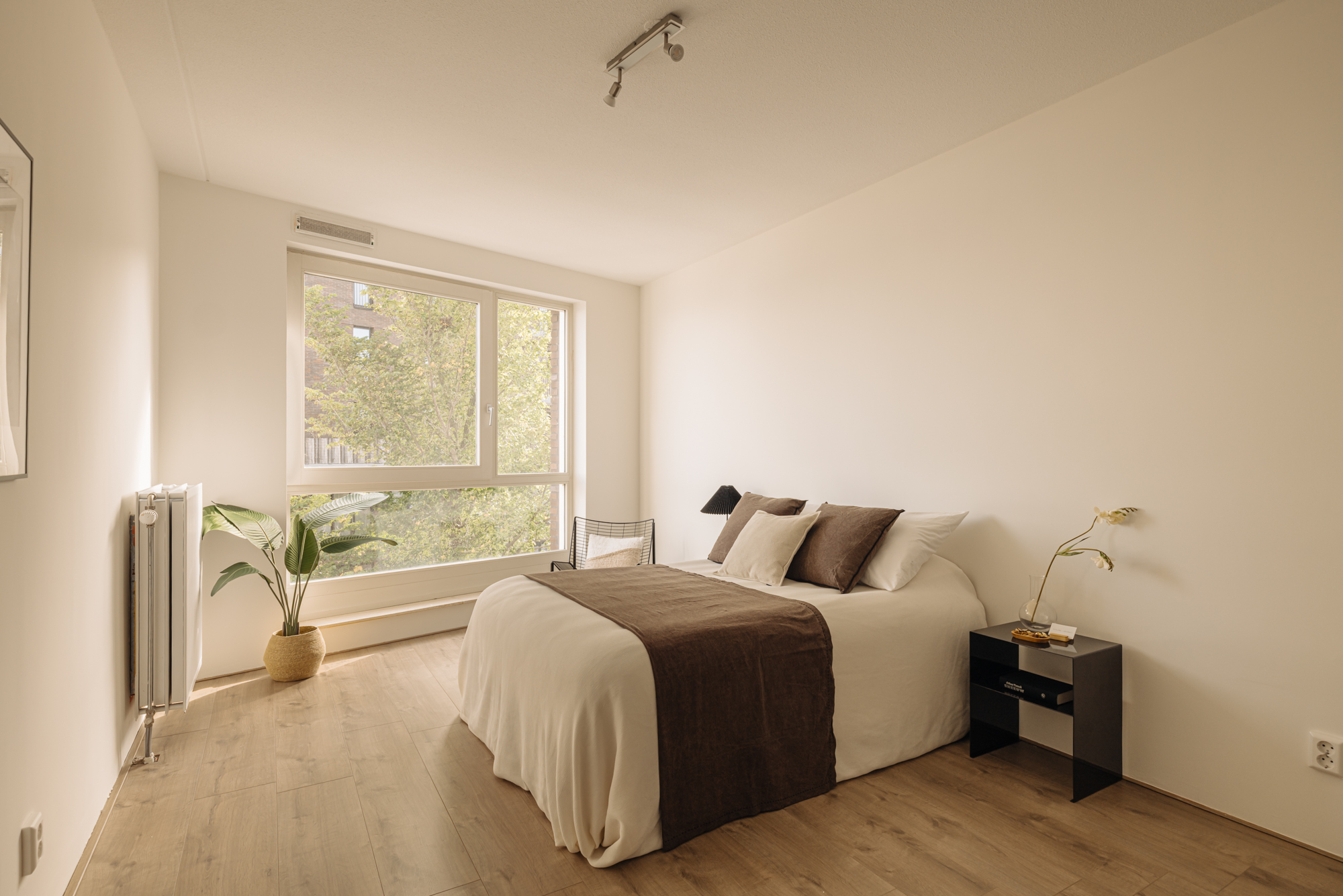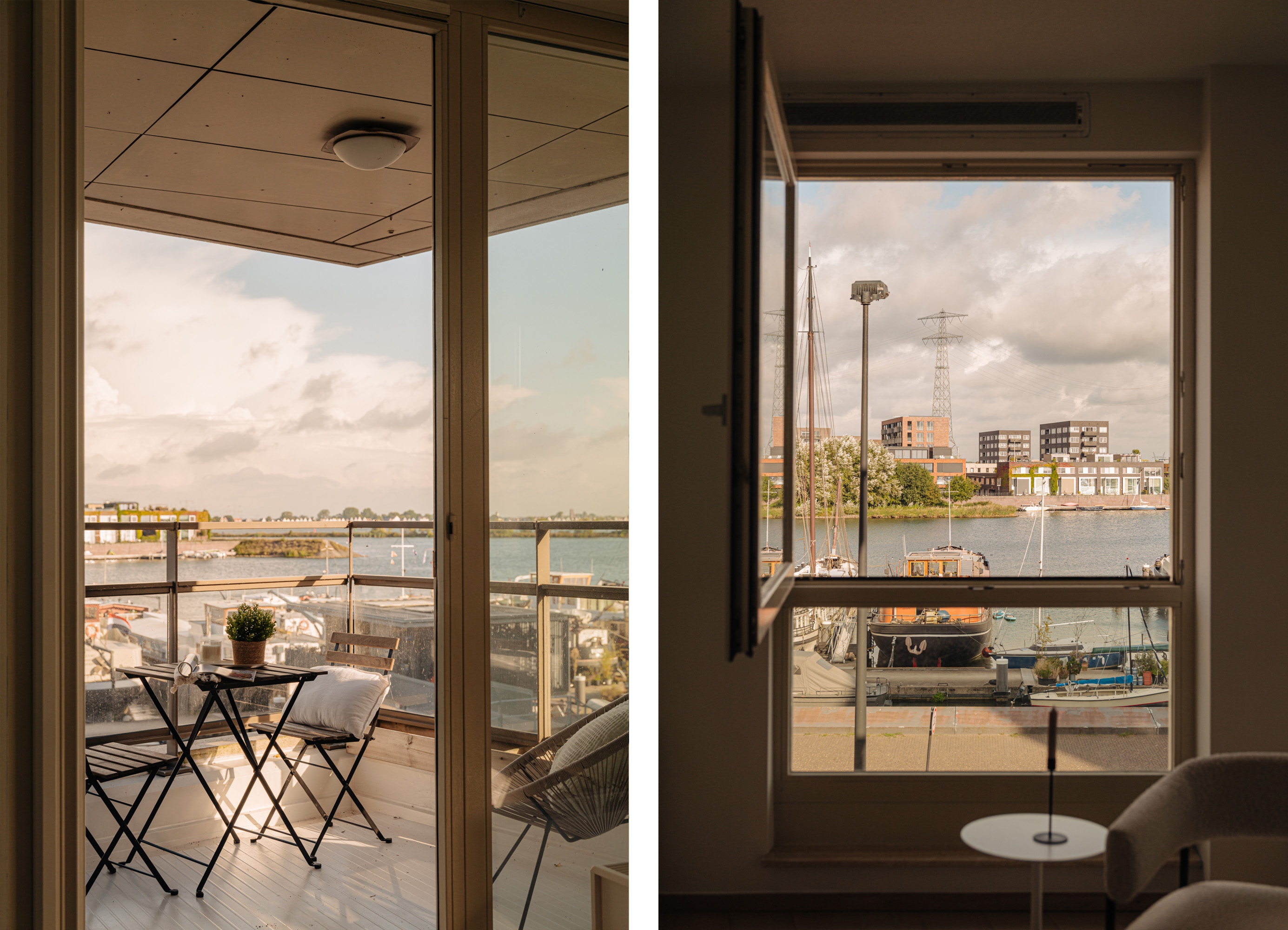 De woonkamer bevindt zich aan de voorzijde van het complex en profiteert dankzij de hoekligging en grote ramen van veel natuurlijk licht. Aansluitend vind je een ruim balkon op het westen, waar je kunt genieten van een prachtig uitzicht over de woonboten en het IJmeer. De zonsondergangen zijn hier werkelijk spectaculair. De open keuken grenst direct aan de woonkamer en is uitgerust met een inductiekookplaat en een combi-oven. De gehele woonruimte is afgewerkt met een lichte lamelparketvloer.