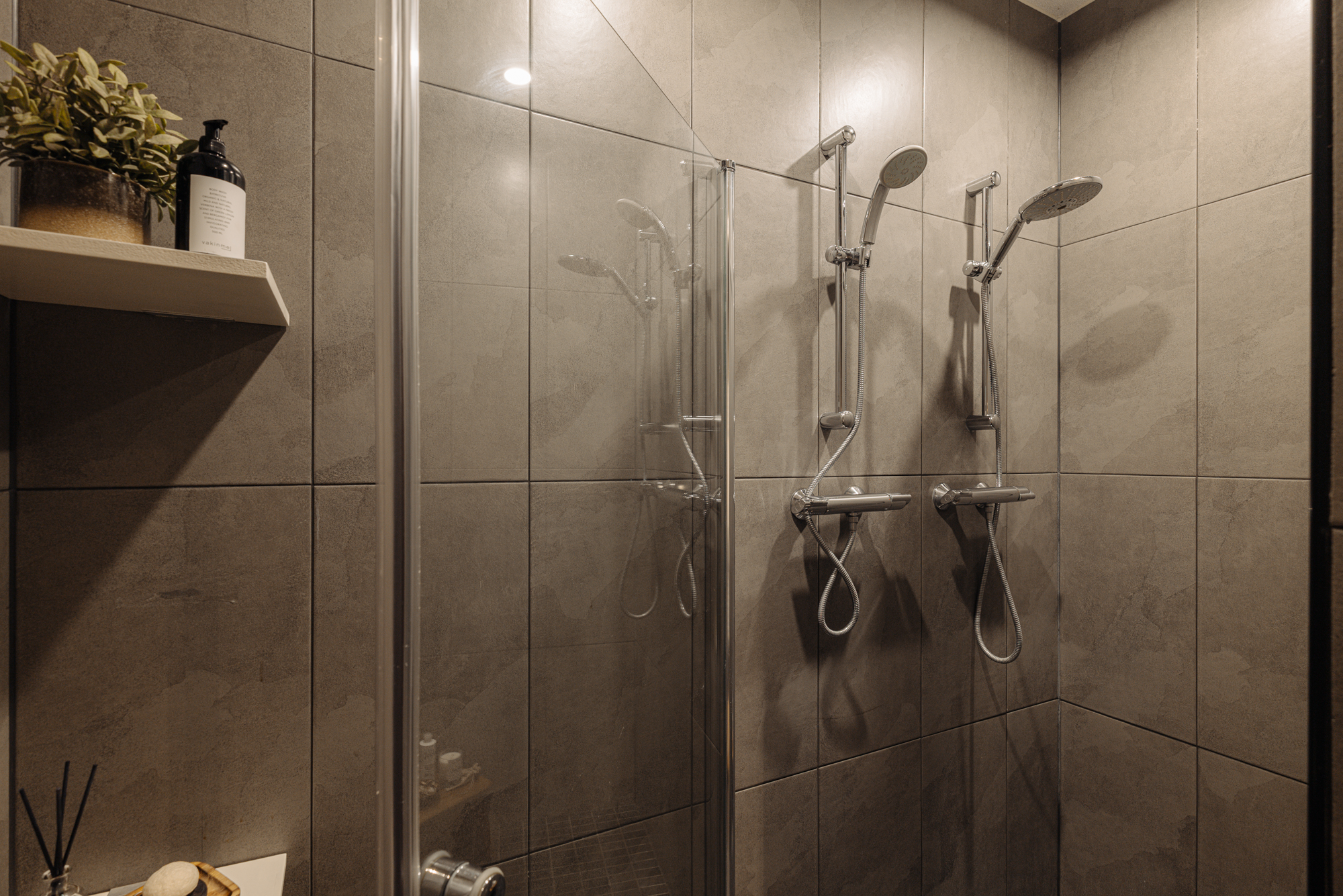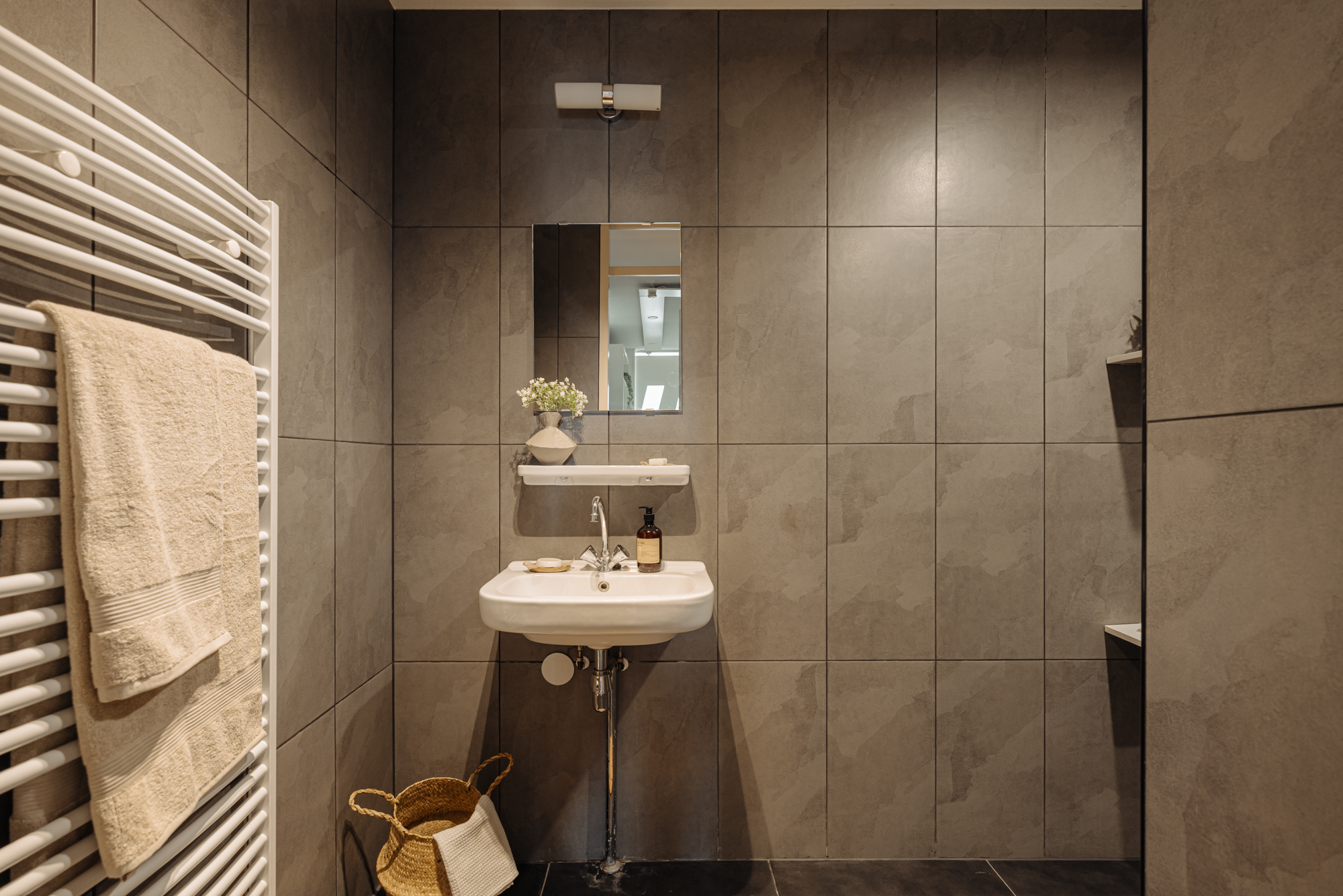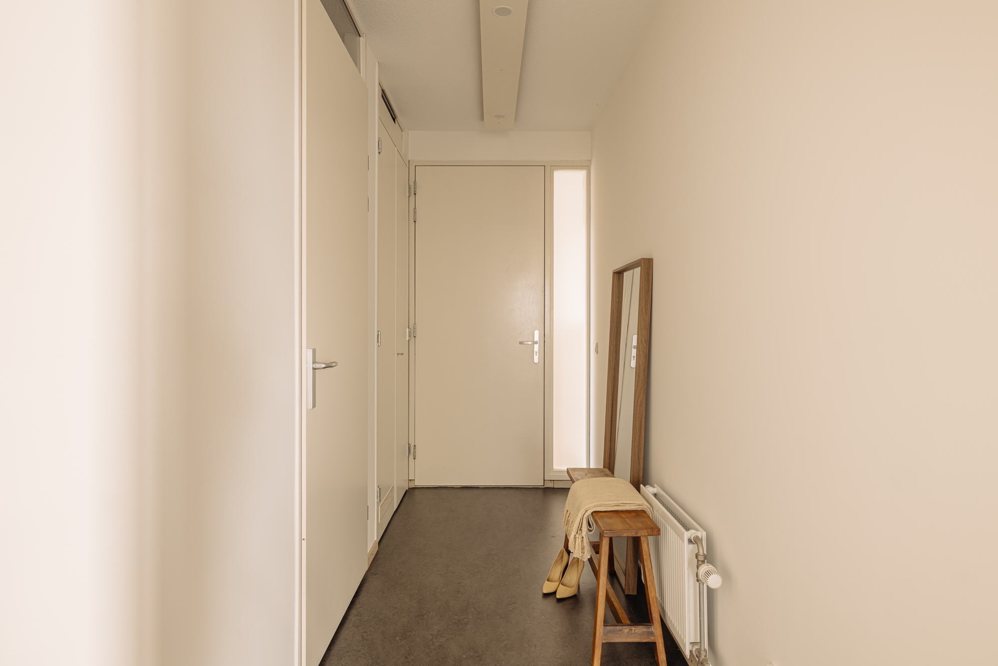 Gemeenschappelijke entree met toegang tot de lift of trap naar de tweede verdieping, waar je via de galerij de woning betreedt. De entree leidt naar een hal die toegang biedt tot een royale interne berging en een luxe badkamer voorzien van een dubbele inloopdouche, een wastafelmeubel en een handdoek-radiator. Vanuit de hal bereik je eveneens twee ruime slaapkamers en een apart toilet.