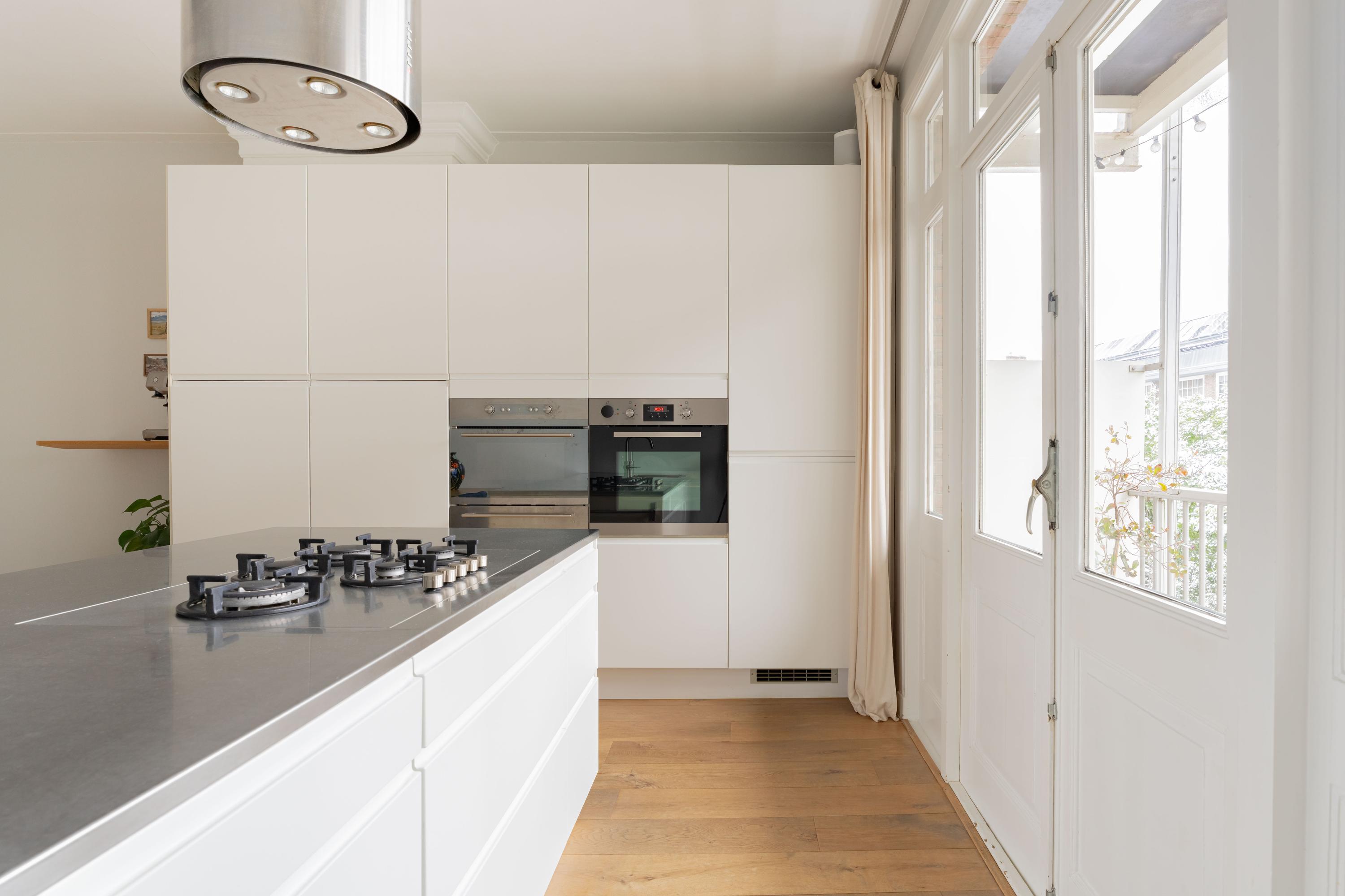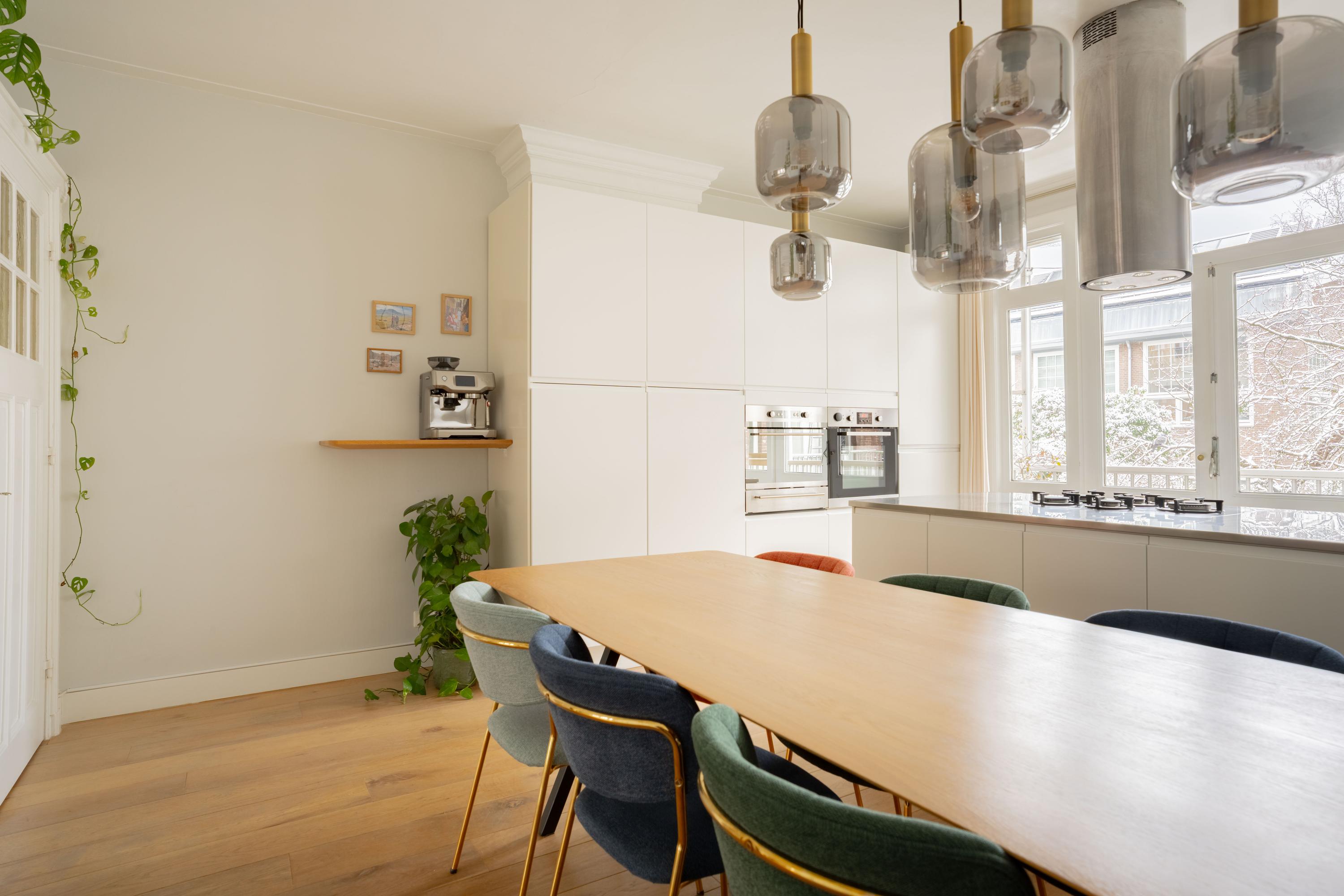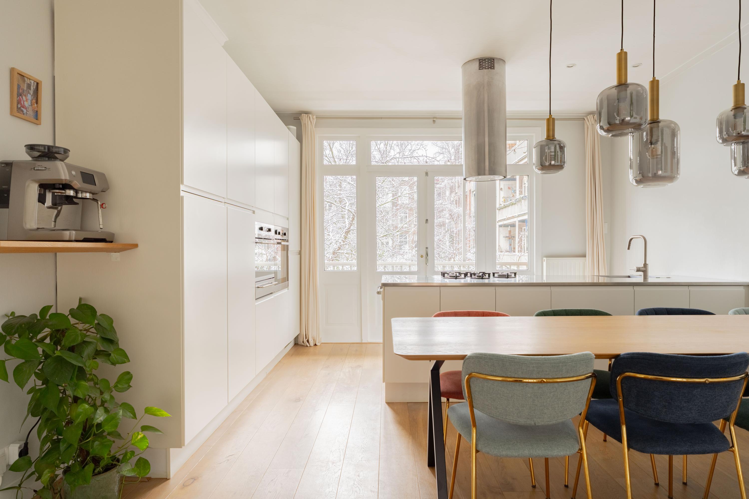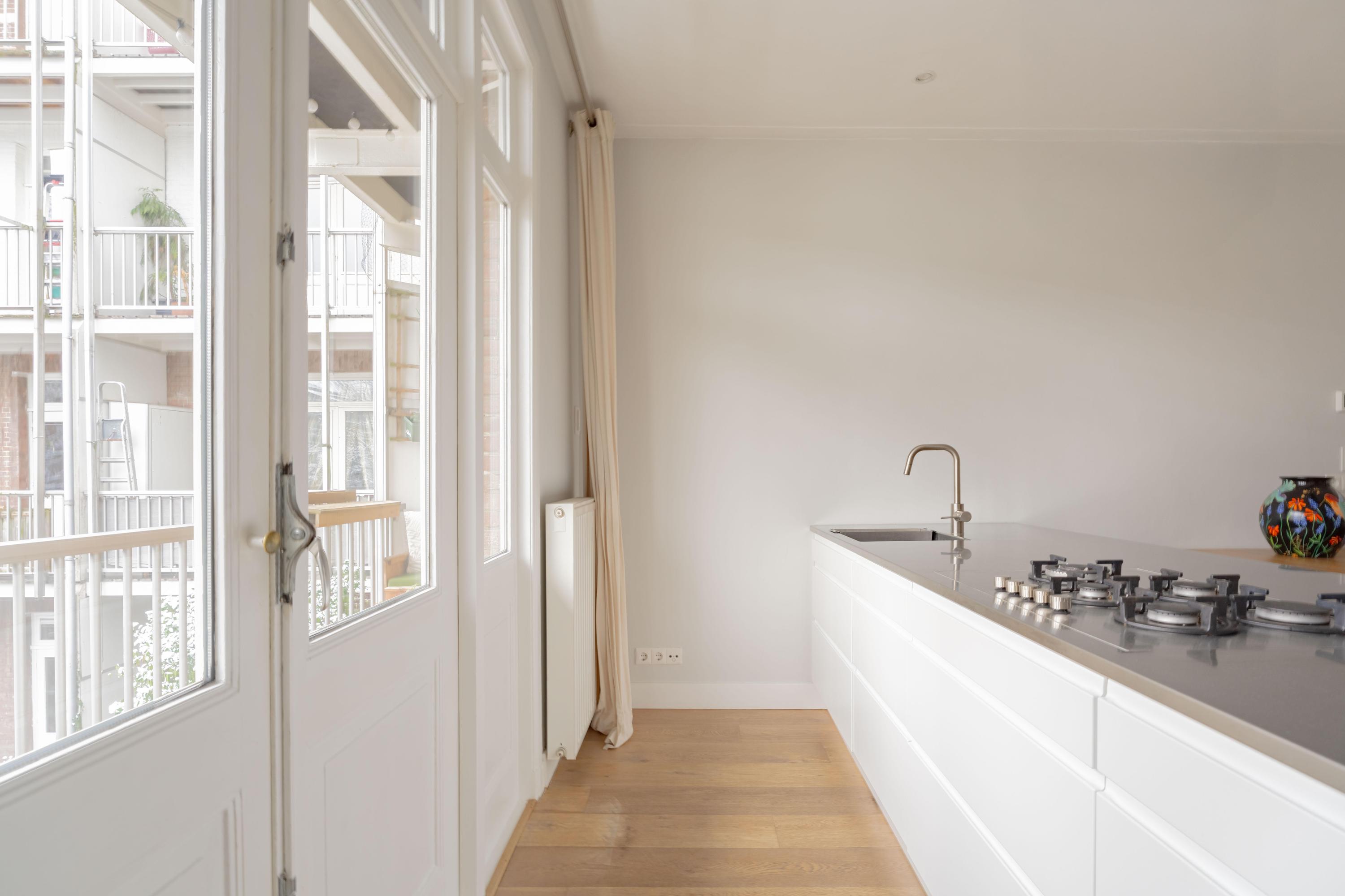 De woonkamer ligt aan de voorzijde en voelt licht en uitnodigend aan. Het appartement is voor Amsterdamse begrippen uitzonderlijk breed, wat zorgt voor verrassend veel woonruimte. De authentieke en suite deuren verbinden de woonkamer met de royale woonkeuken aan de achterzijde. Open vormen de ruimtes één geheel; gesloten creëer je juist een knusse zitkamer en een aparte eetkeuken. Die flexibiliteit maakt deze indeling zo prettig in het dagelijks gebruik.