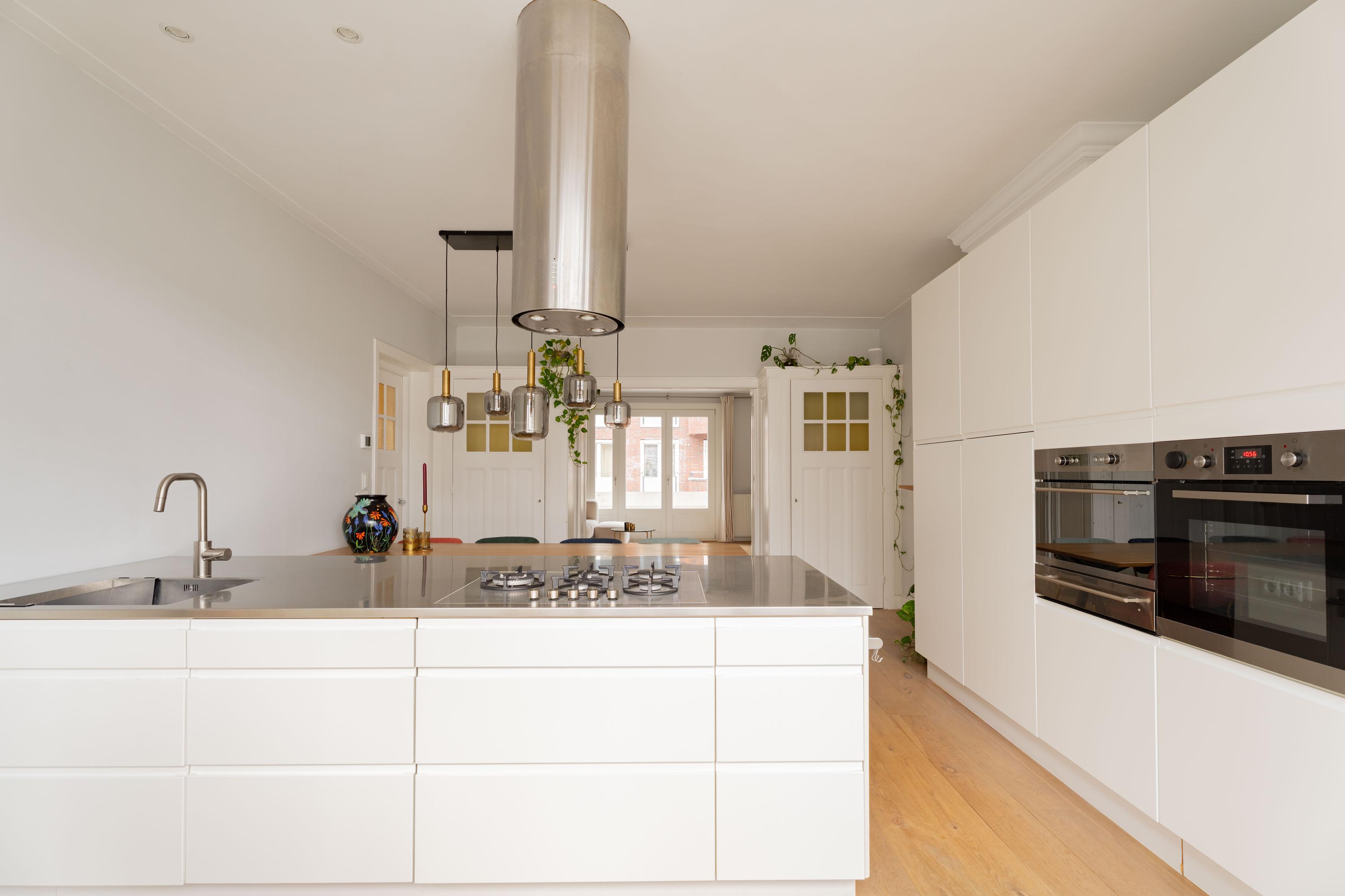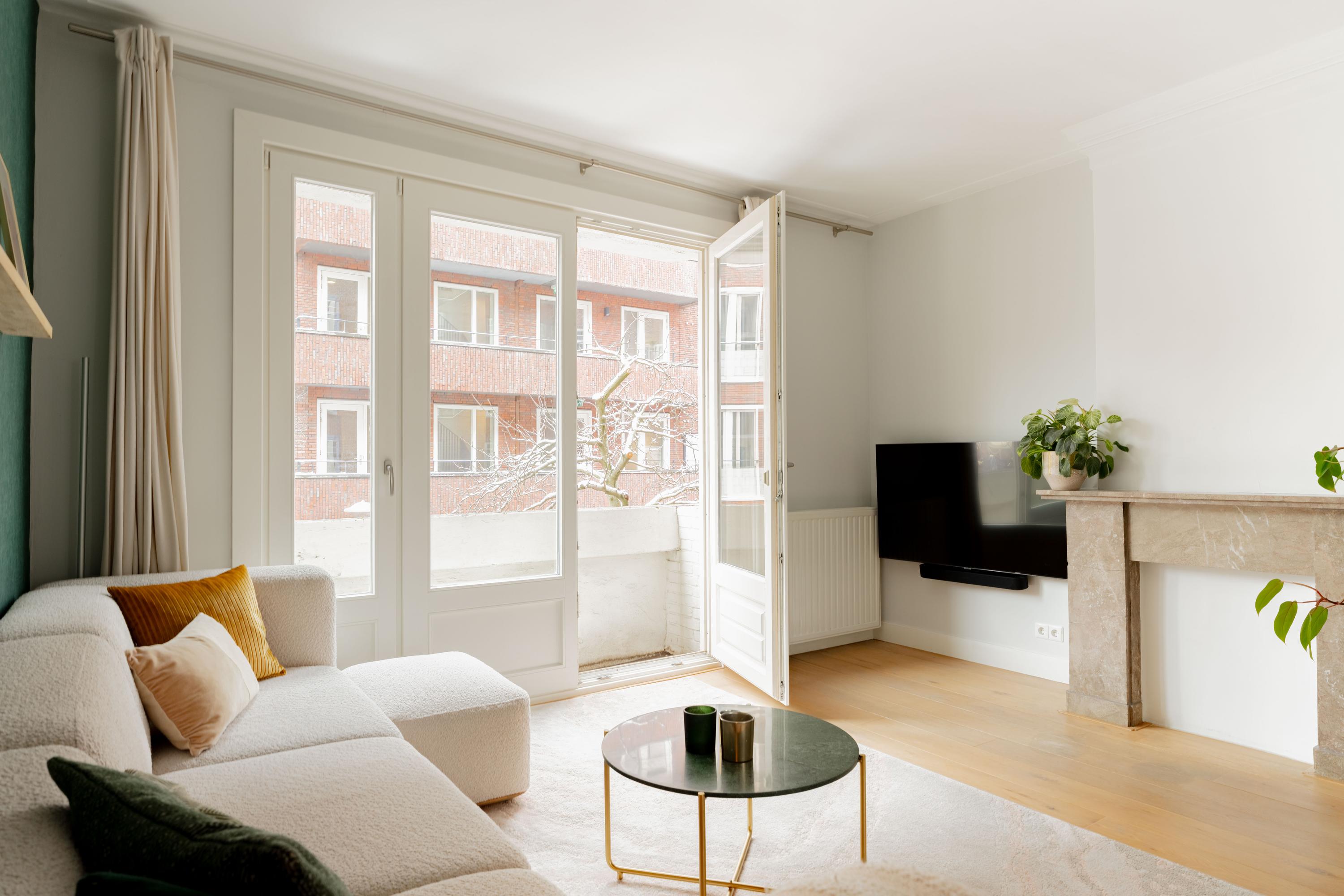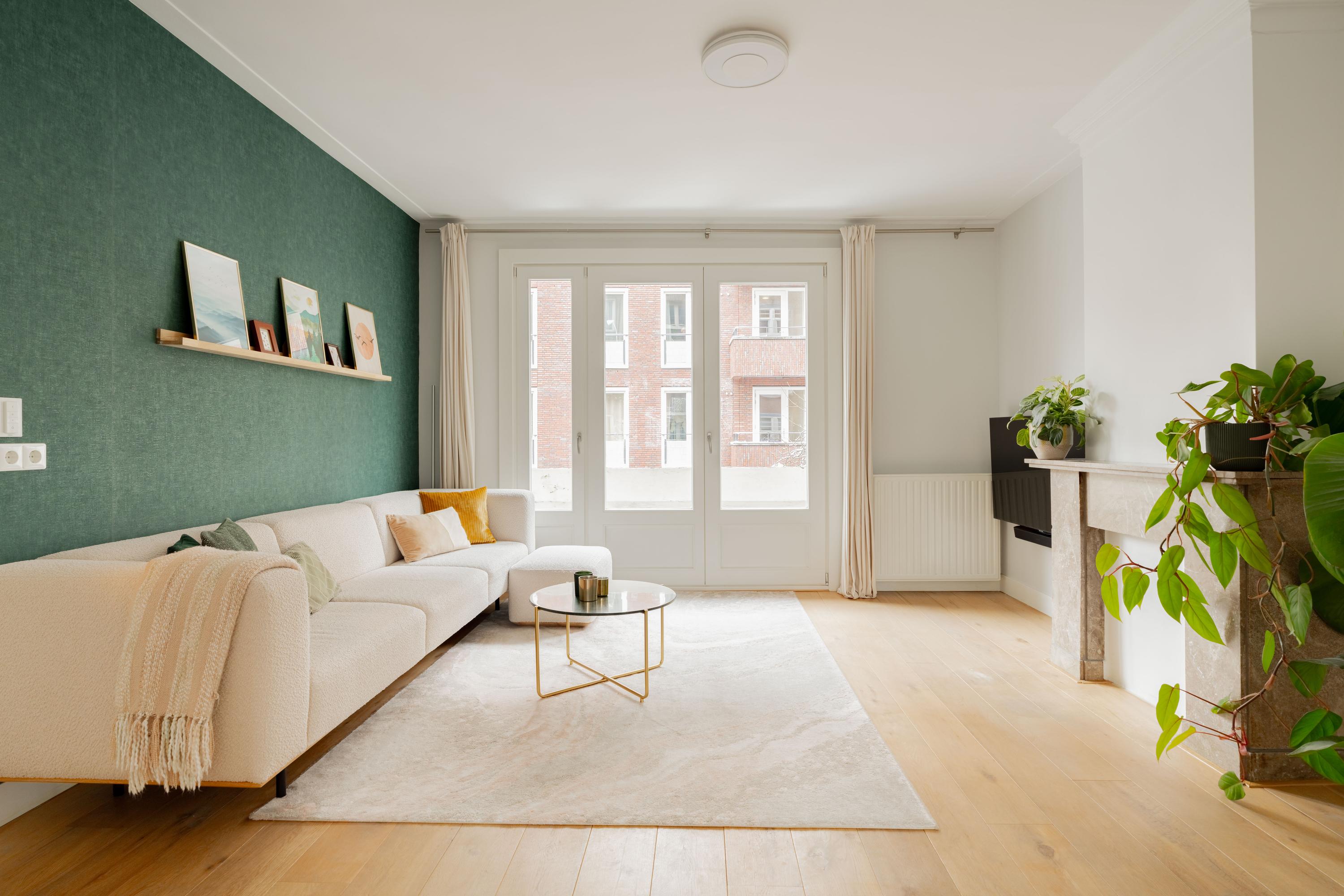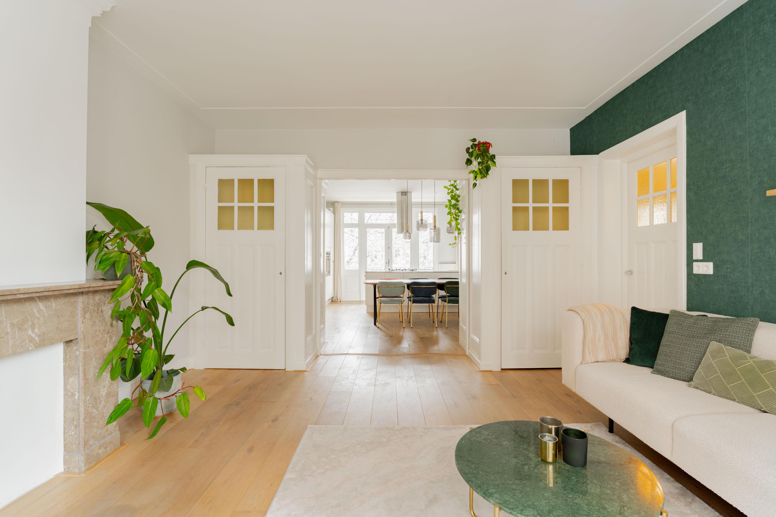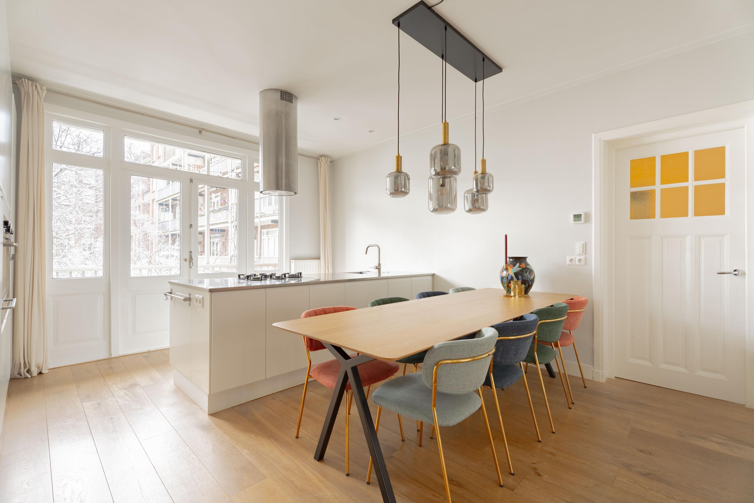 De woonkamer ligt aan de voorzijde en voelt licht en uitnodigend aan. Het appartement is voor Amsterdamse begrippen uitzonderlijk breed, wat zorgt voor verrassend veel woonruimte. De authentieke en suite deuren verbinden de woonkamer met de royale woonkeuken aan de achterzijde. Open vormen de ruimtes één geheel; gesloten creëer je juist een knusse zitkamer en een aparte eetkeuken. Die flexibiliteit maakt deze indeling zo prettig in het dagelijks gebruik.