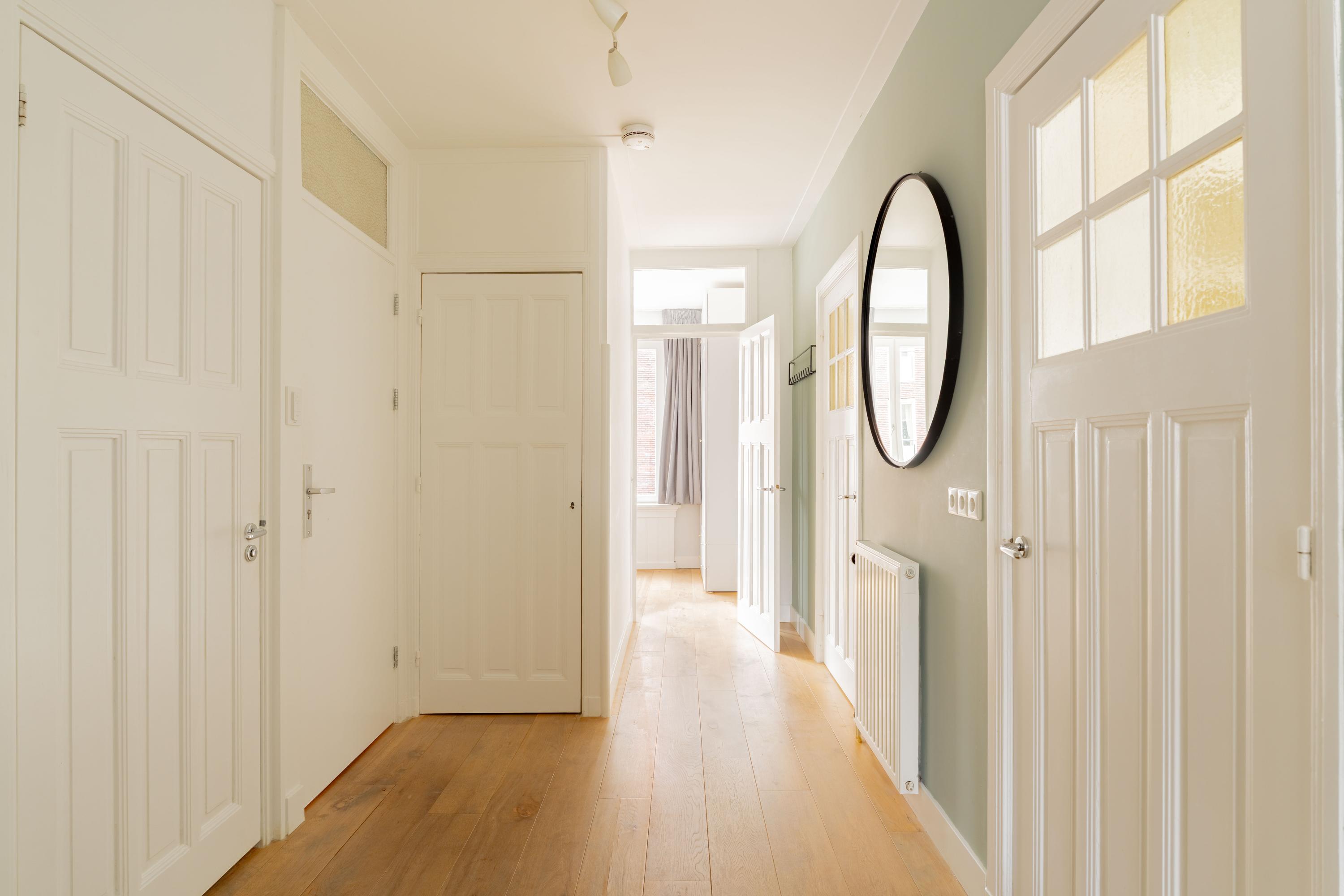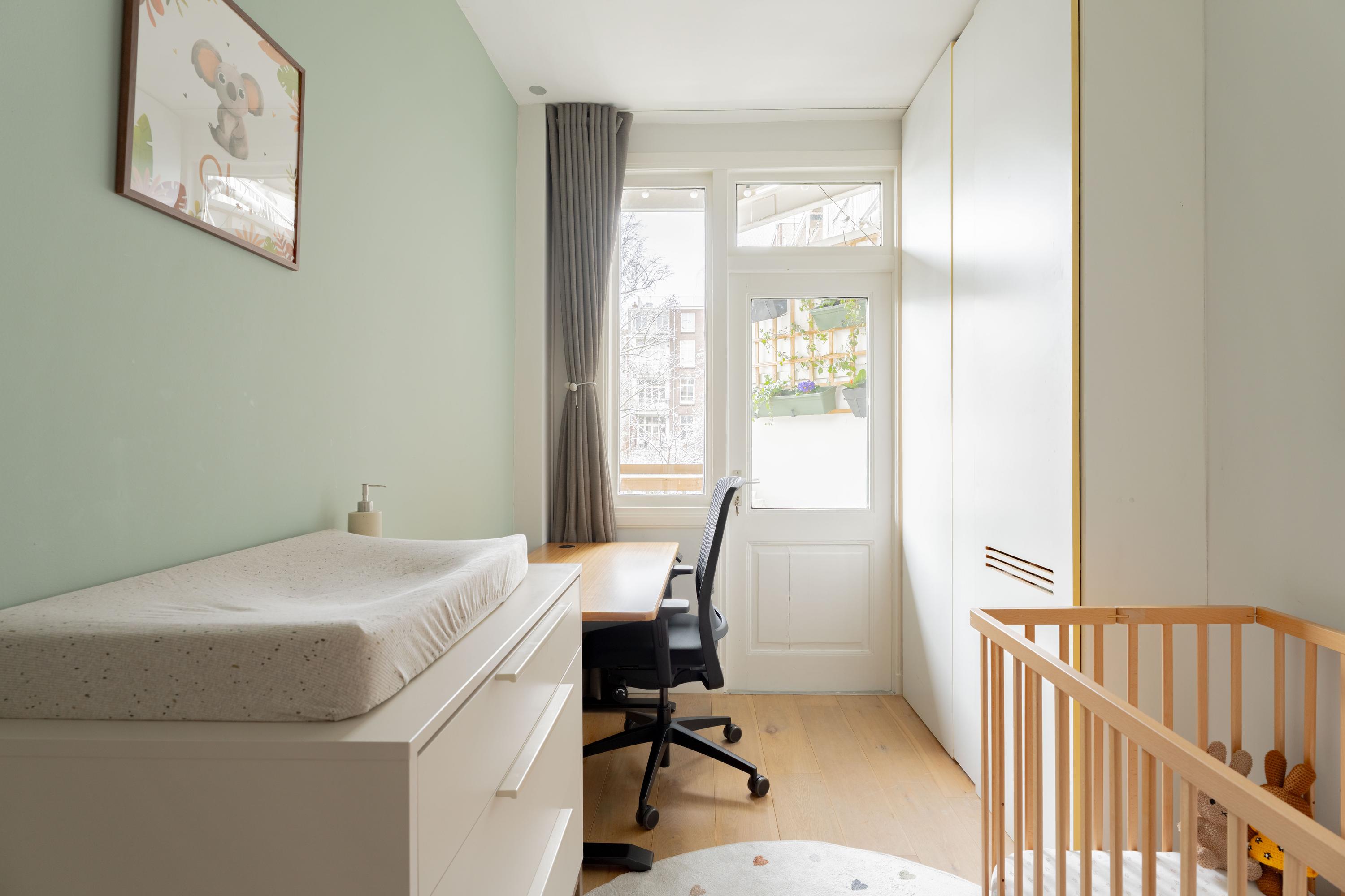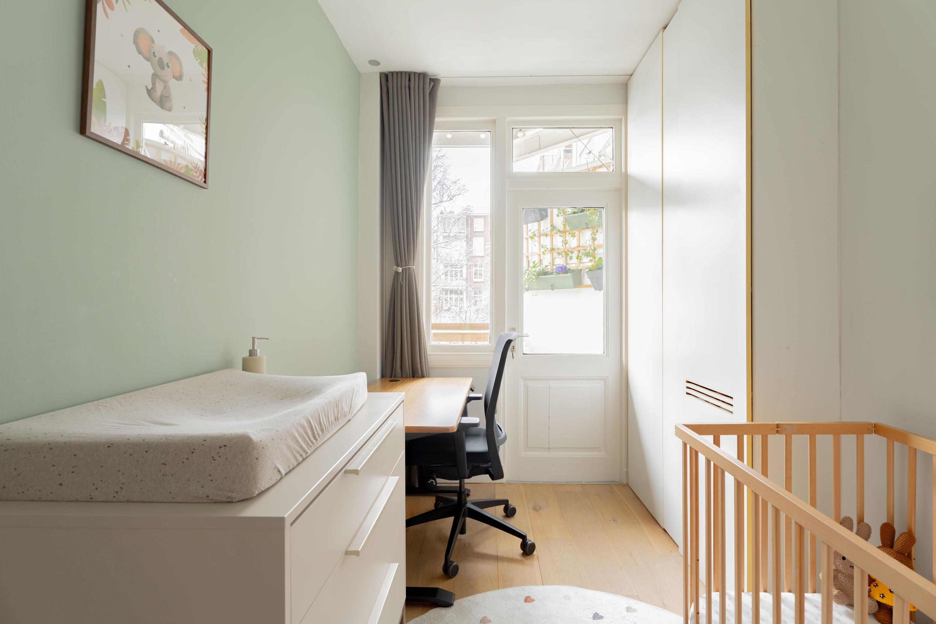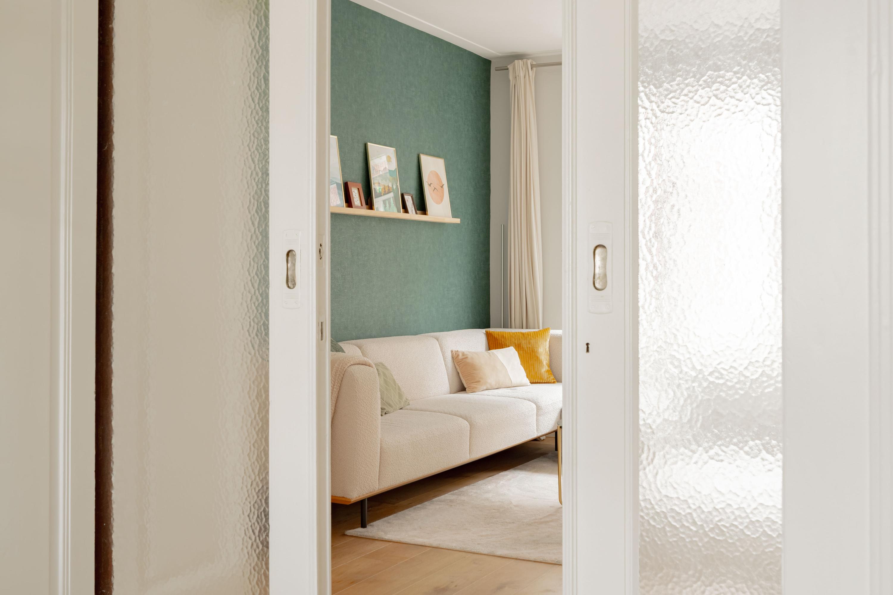 De woonkamer ligt aan de voorzijde en voelt licht en uitnodigend aan. Het appartement is voor Amsterdamse begrippen uitzonderlijk breed, wat zorgt voor verrassend veel woonruimte. De authentieke en suite deuren verbinden de woonkamer met de royale woonkeuken aan de achterzijde. Open vormen de ruimtes één geheel; gesloten creëer je juist een knusse zitkamer en een aparte eetkeuken. Die flexibiliteit maakt deze indeling zo prettig in het dagelijks gebruik.