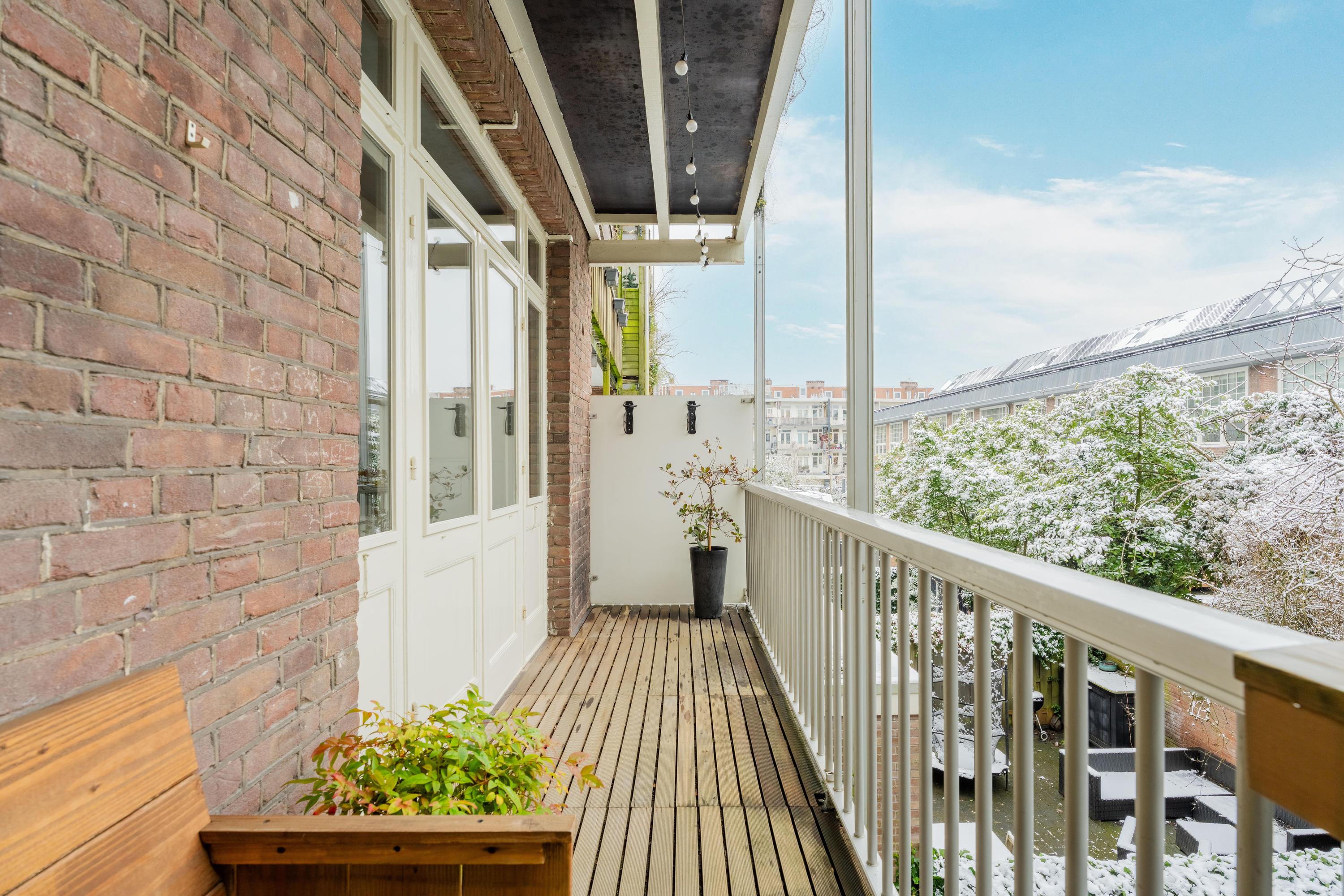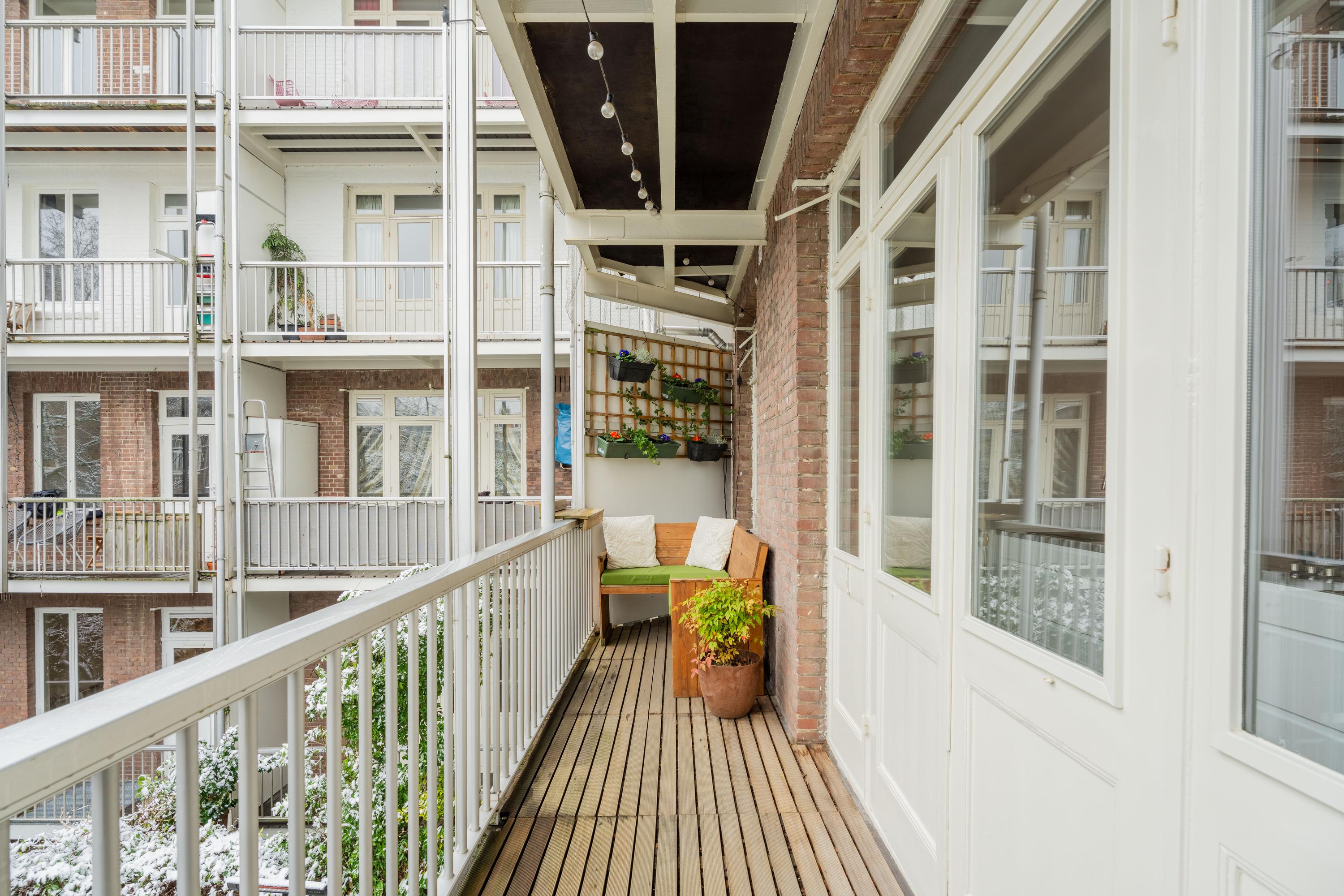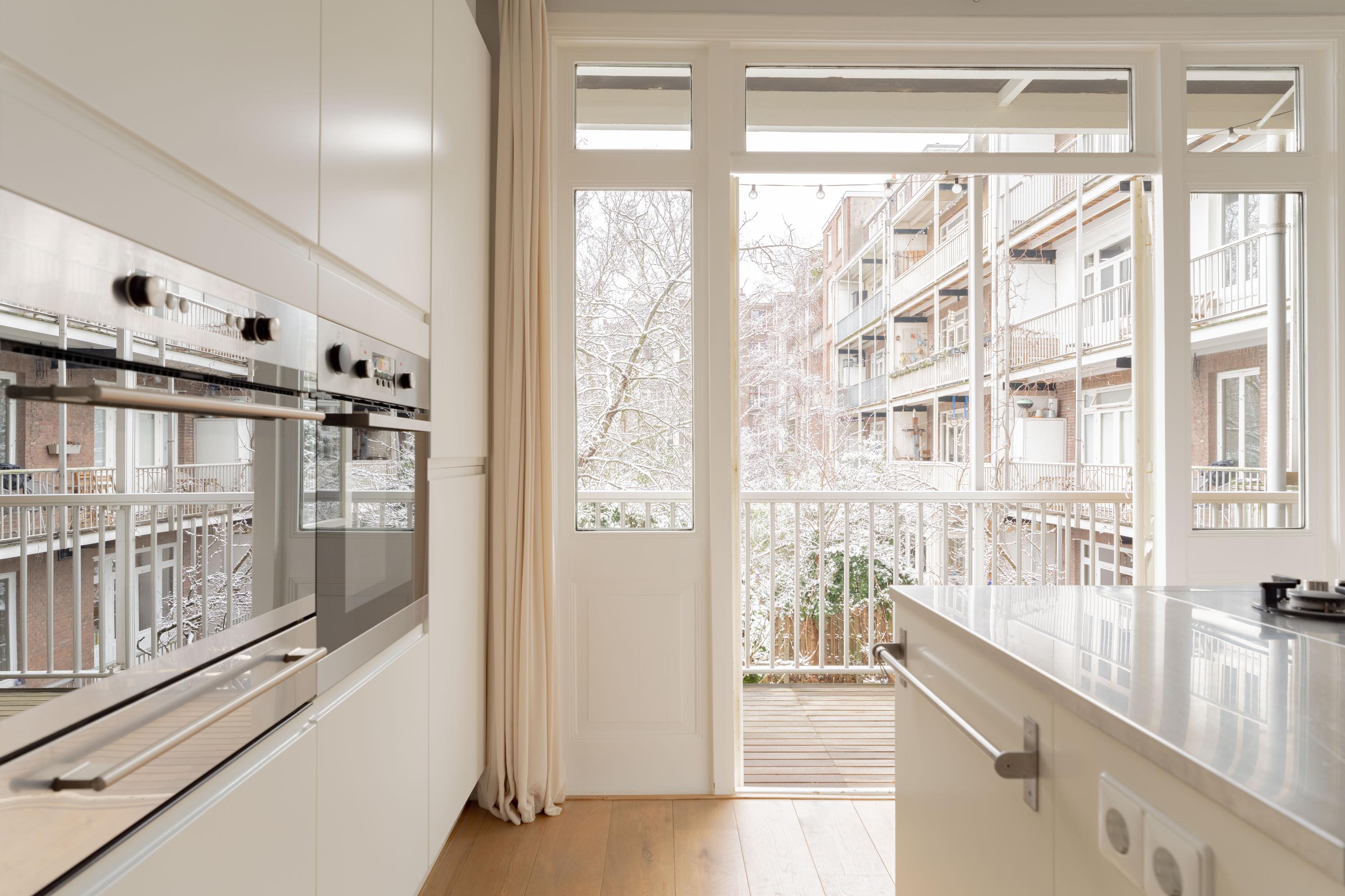 Vanuit de keuken zijn er openslaande deuren naar het rustig gelegen balkon, een fijne plek om buiten te zitten met uitzicht op het groene binnenterrein. Aan de voorzijde heb je tevens openslaande deuren naar een balkon.
