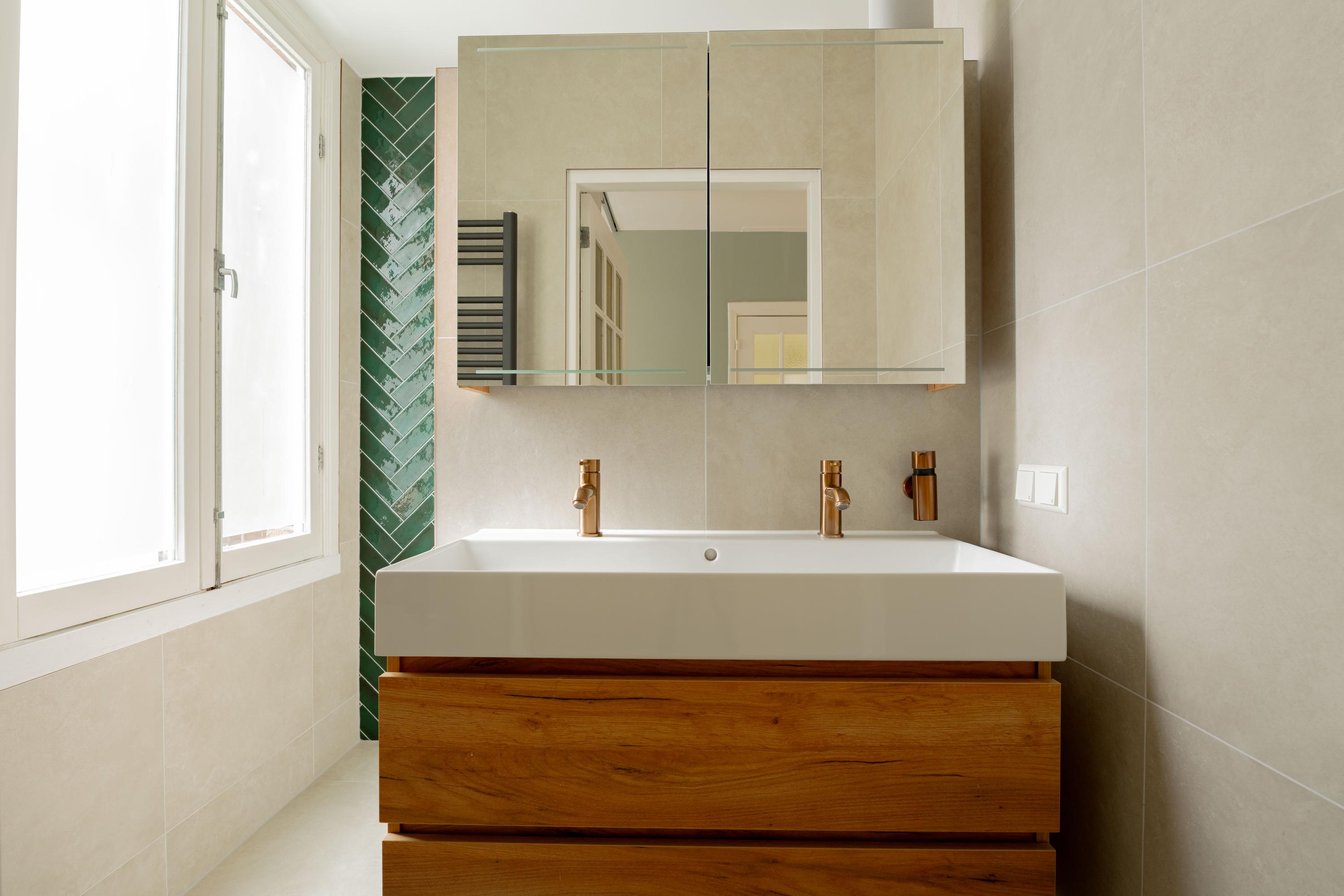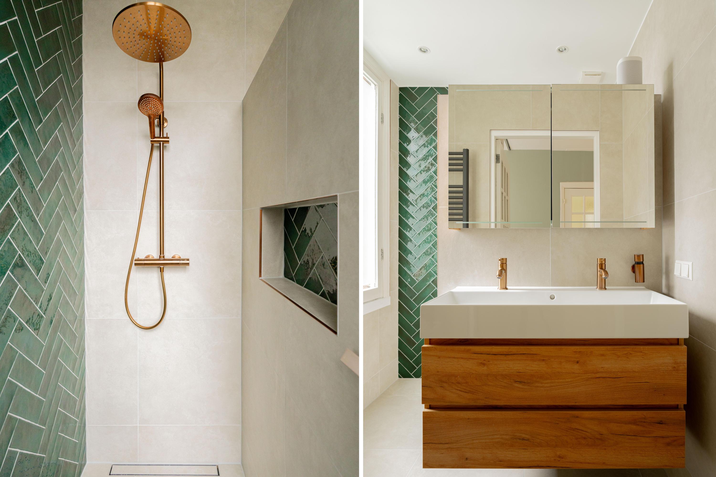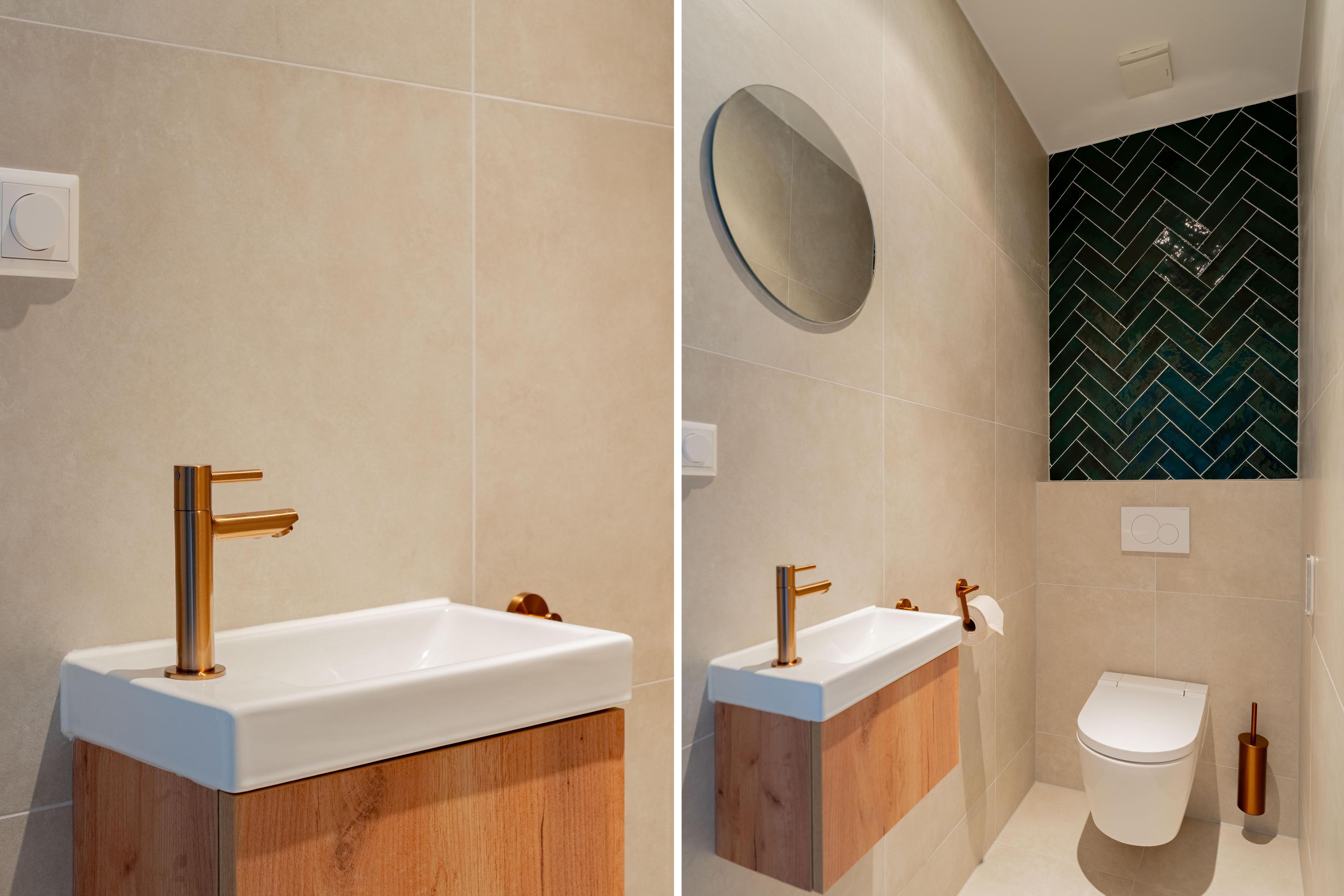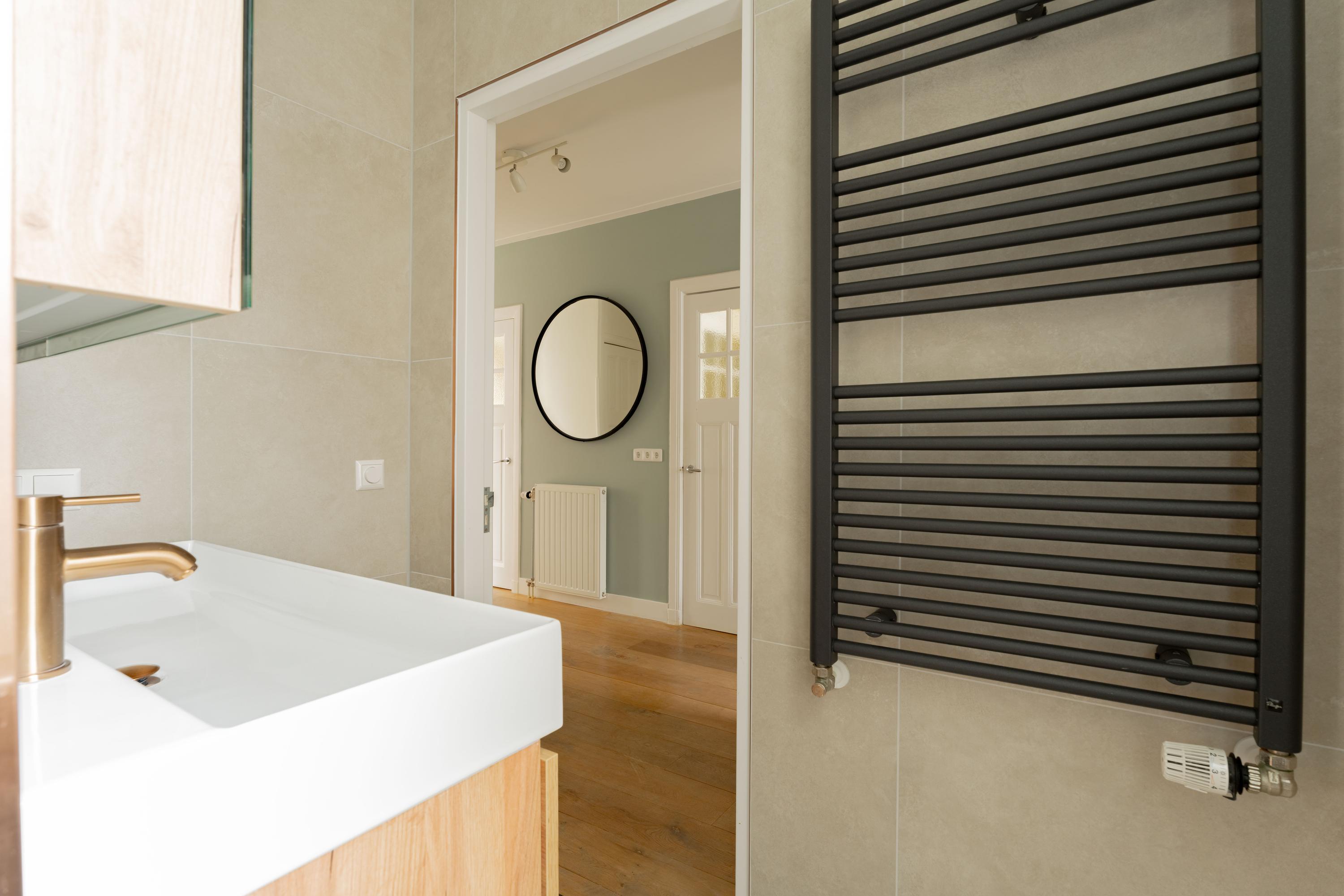 De in 2024 gerenoveerde badkamer is uitgevoerd in een moderne, warme stijl met hoogwaardige materialen. Denk aan grootformaat wandtegels, een stijlvol wastafelmeubel met dubbele kraan en een inloop regendouche. Het separate douchetoilet is in dezelfde lijn afgewerkt, wat zorgt voor een mooi en rustig geheel. Alles voelt verzorgd en eigentijds aan.