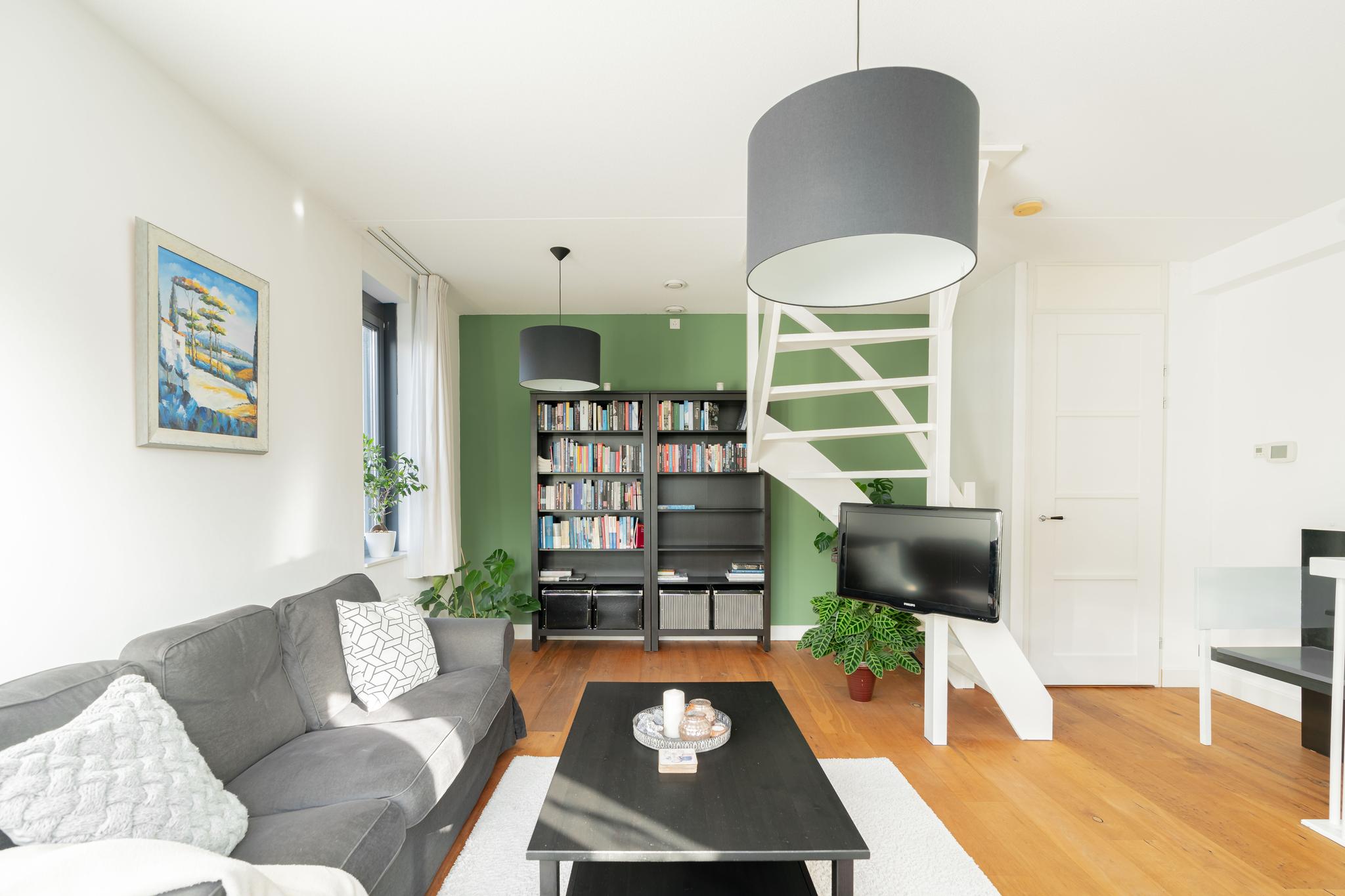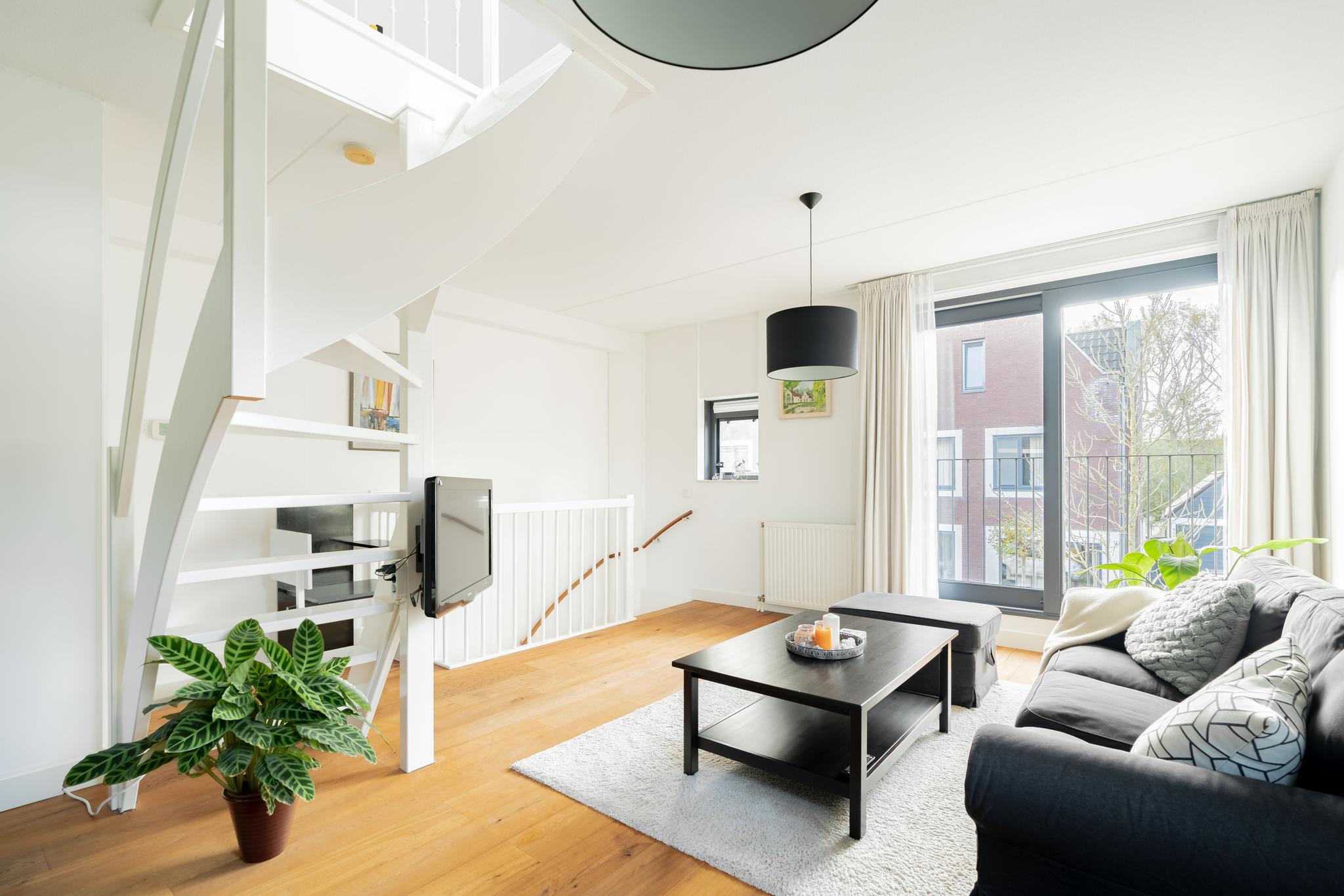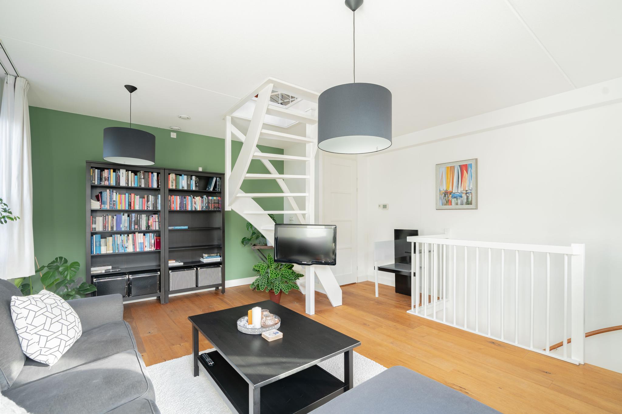 Lichte woonkamer met veel ramen. Vanuit de woonkamer toegang naar de kapverdieping waar de charmante slaapkamer zich bevindt voorzien van dakramen.