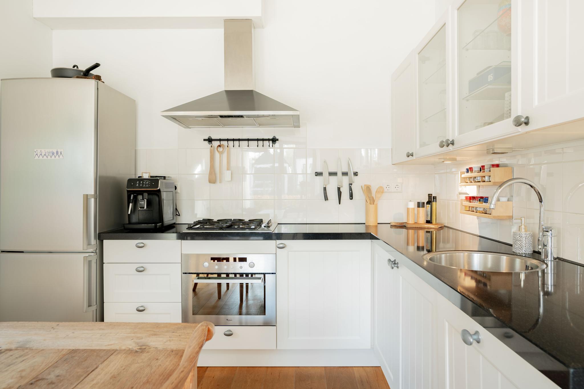 Spacious hall with access to the spacious bathroom and kitchen/diner on the ground floor. The country-style kitchen is equipped with various built-in appliances. The natural light, combined with the beautiful finish and corner location, creates a peaceful and inviting atmosphere. At the front is a sunny and unique front garden.