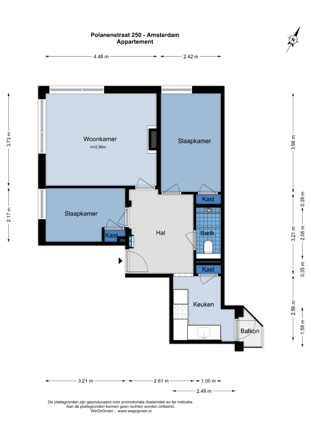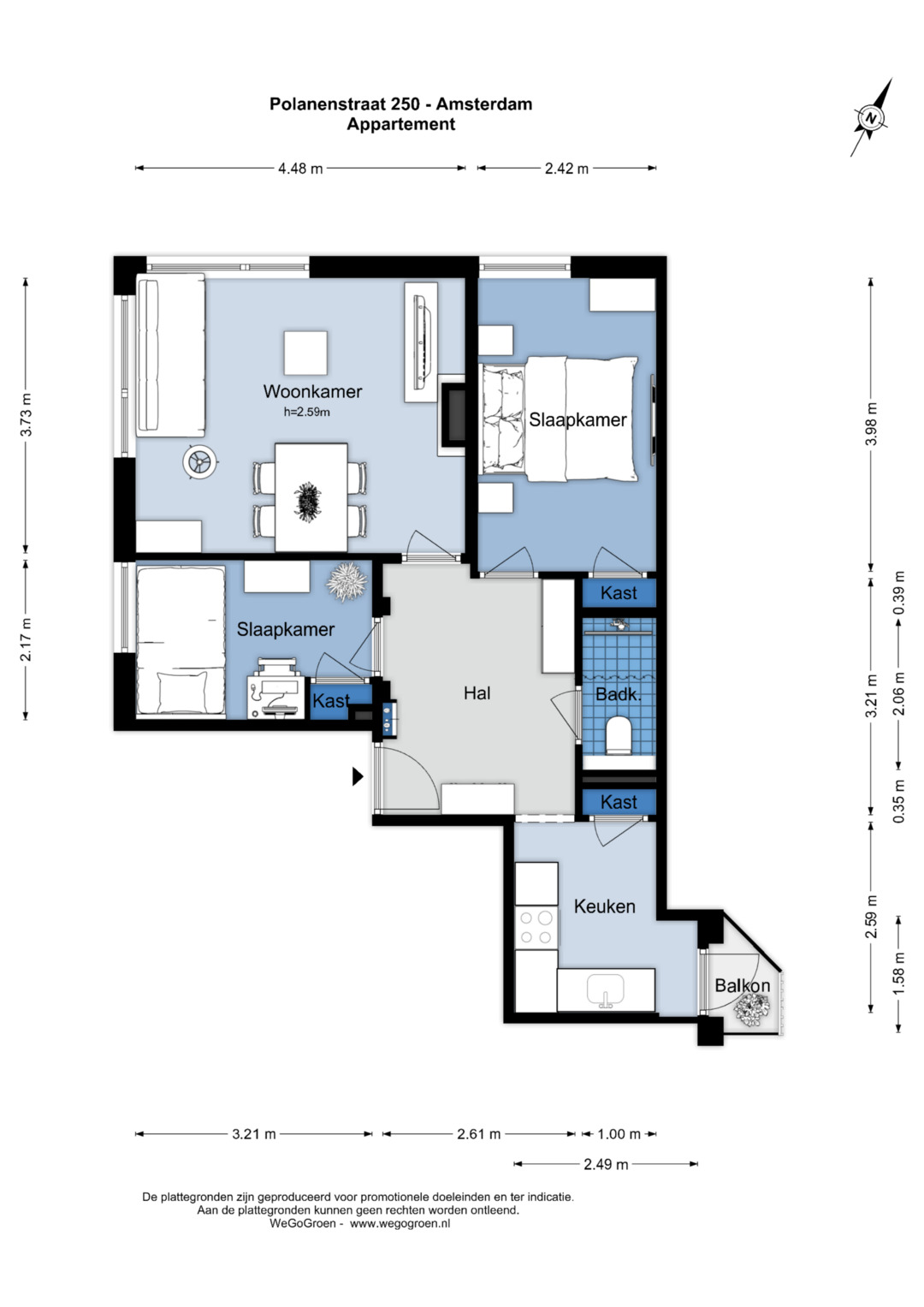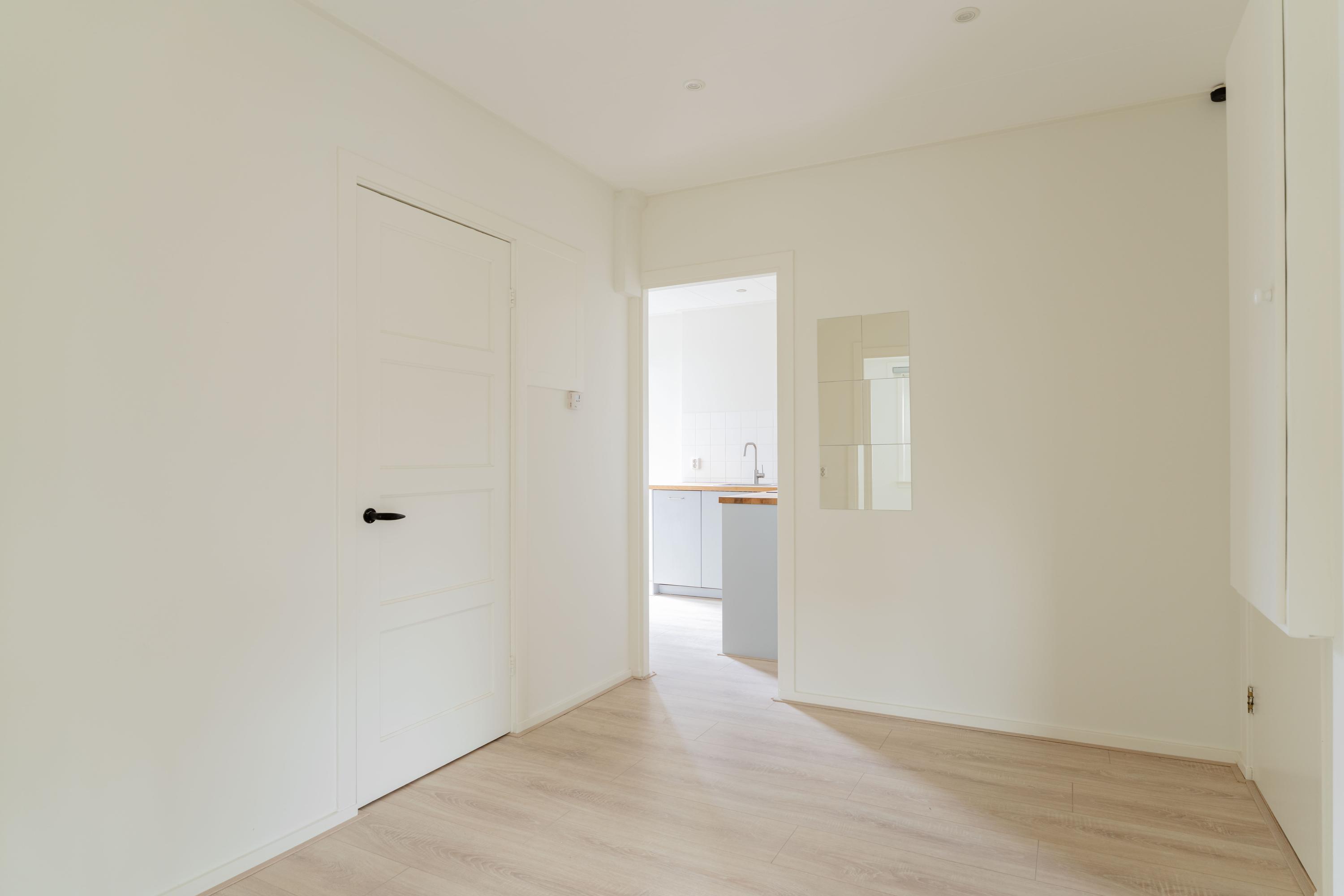 Ruime hal met toegang tot alle vertrekken. Aan de voorzijde bevindt zich de lichte woonkamer met grote raampartijen. Naast de woonkamer zijn de slaapkamers (voorzien van inbouwkasten) gelegen en centraal in de hal toegang naar de badkamer voorzien van een douche en het toilet. De keukenruimte bevindt zich aan de achterzijde en toegang naar het heerlijke balkon.