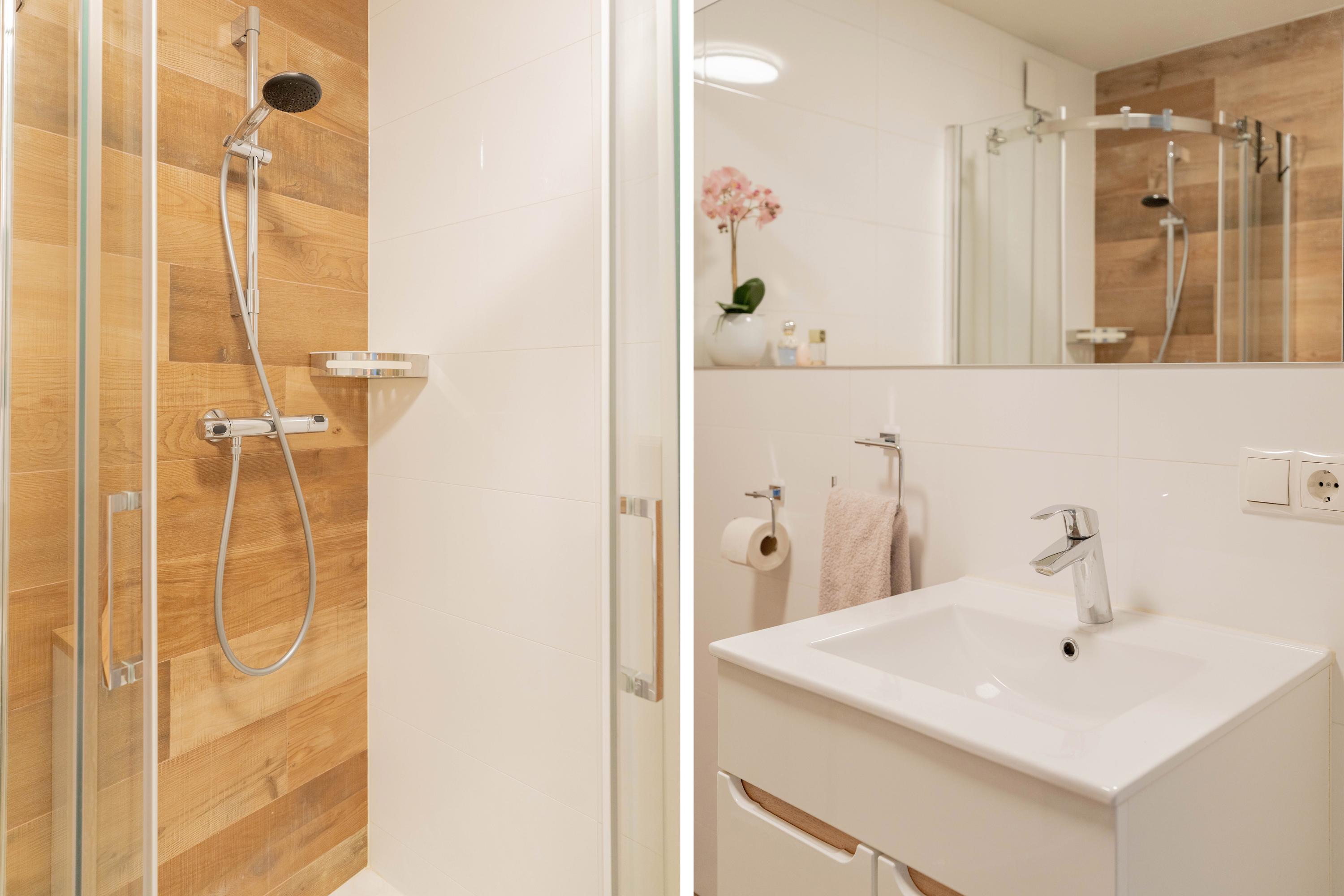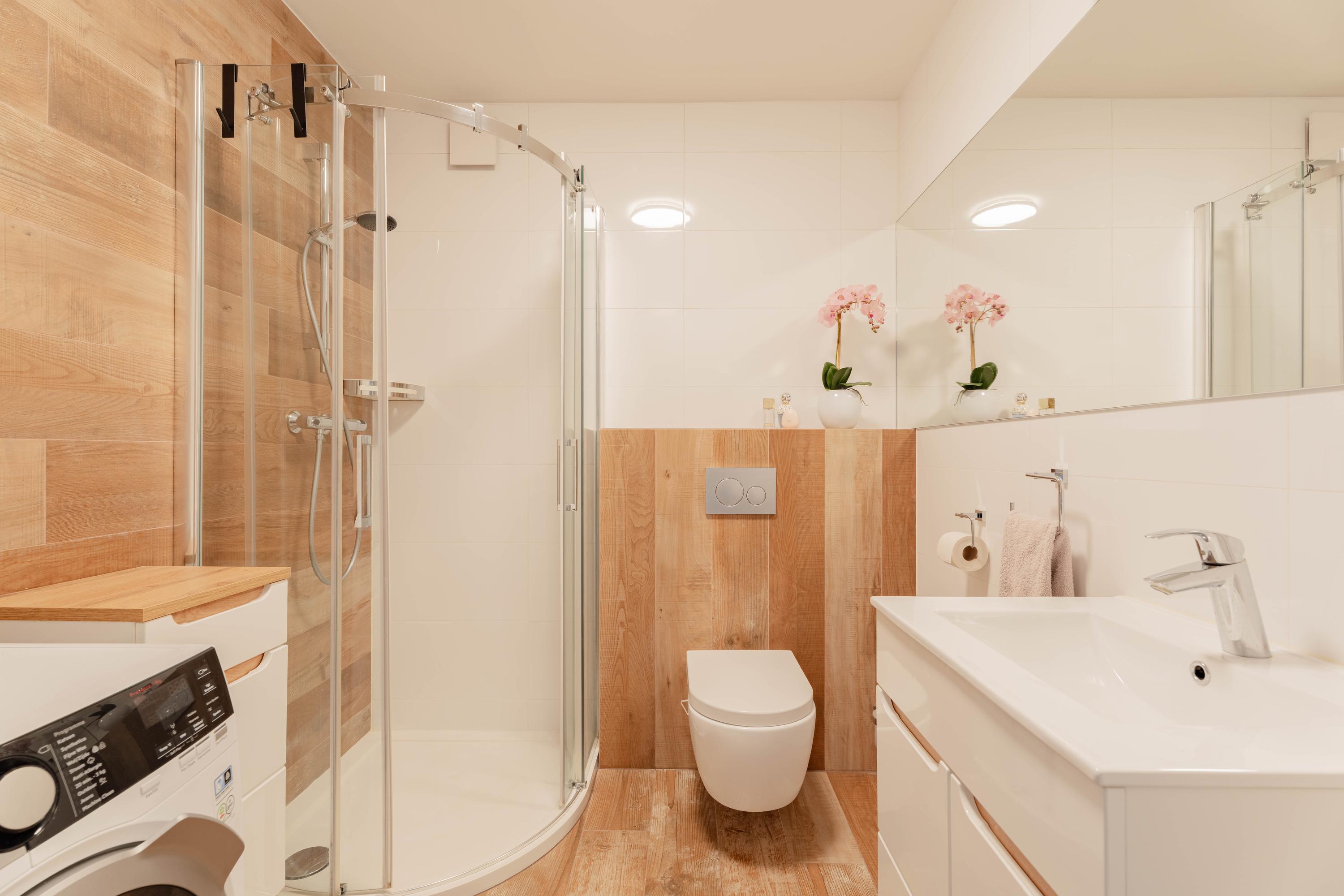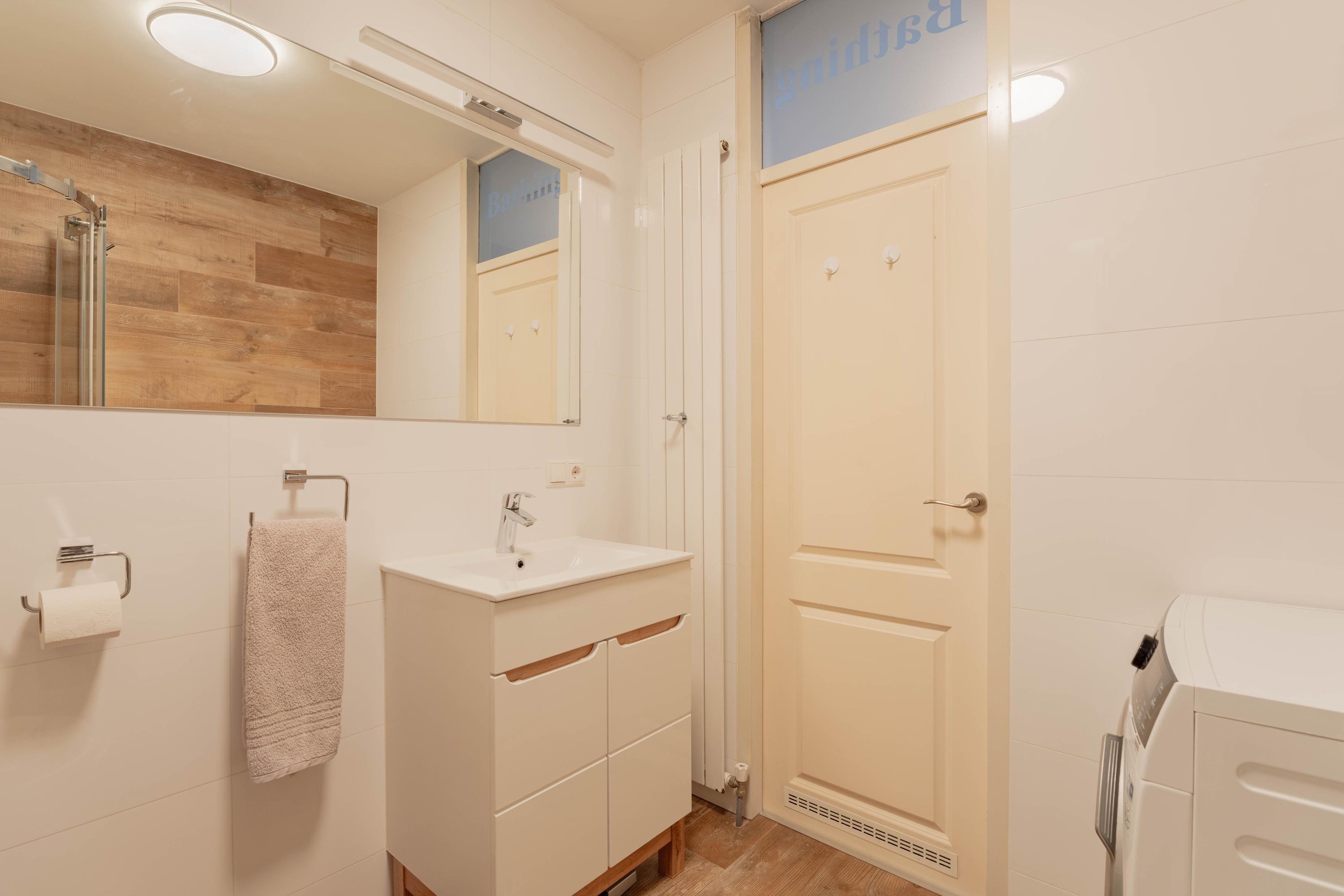 - Ruime badkamer met douche, toilet en wasmachineaansluiting