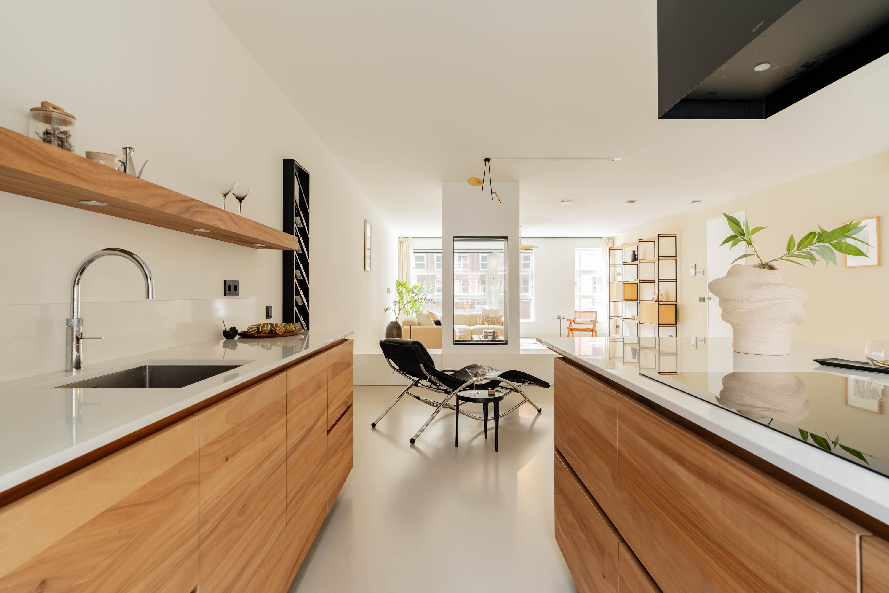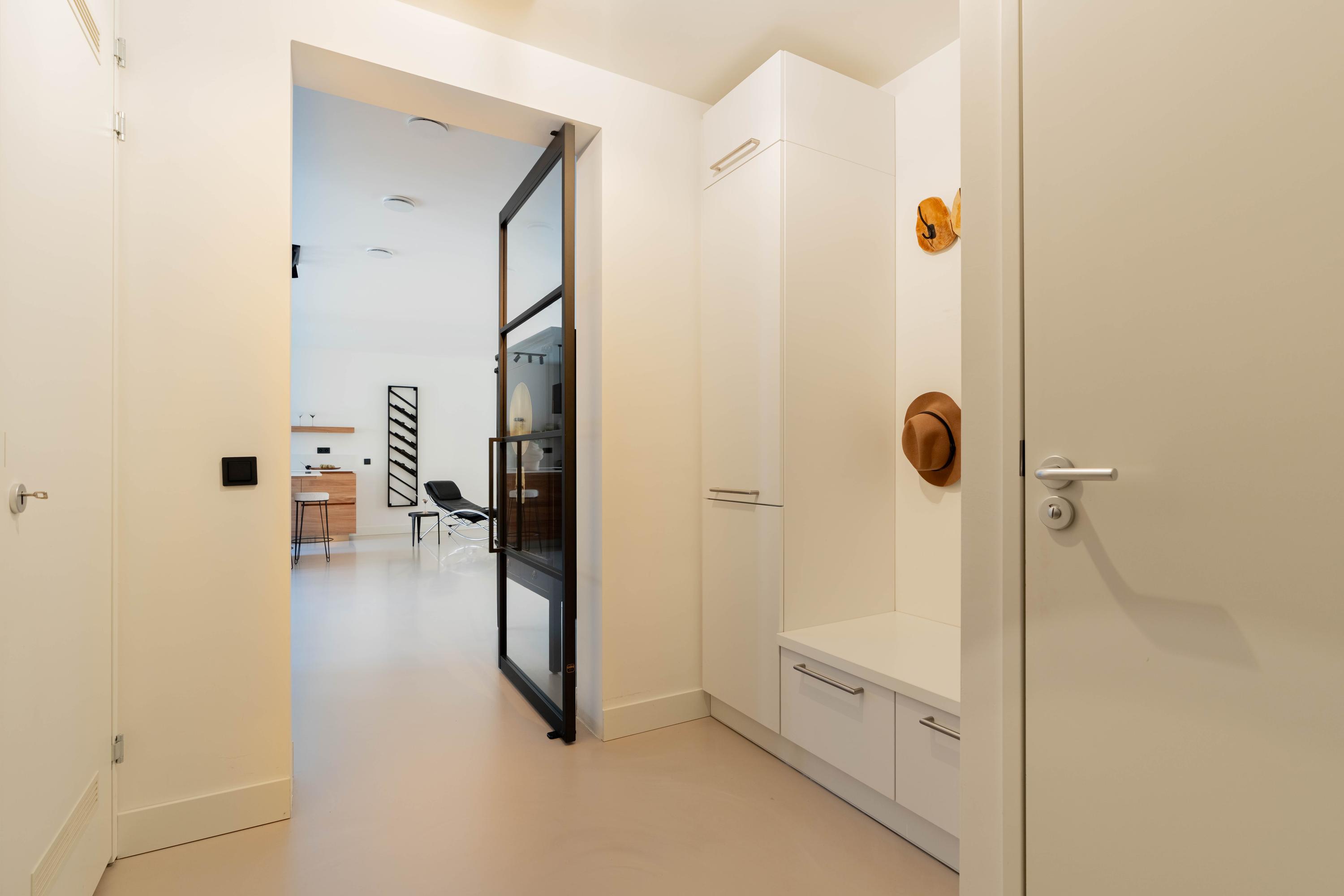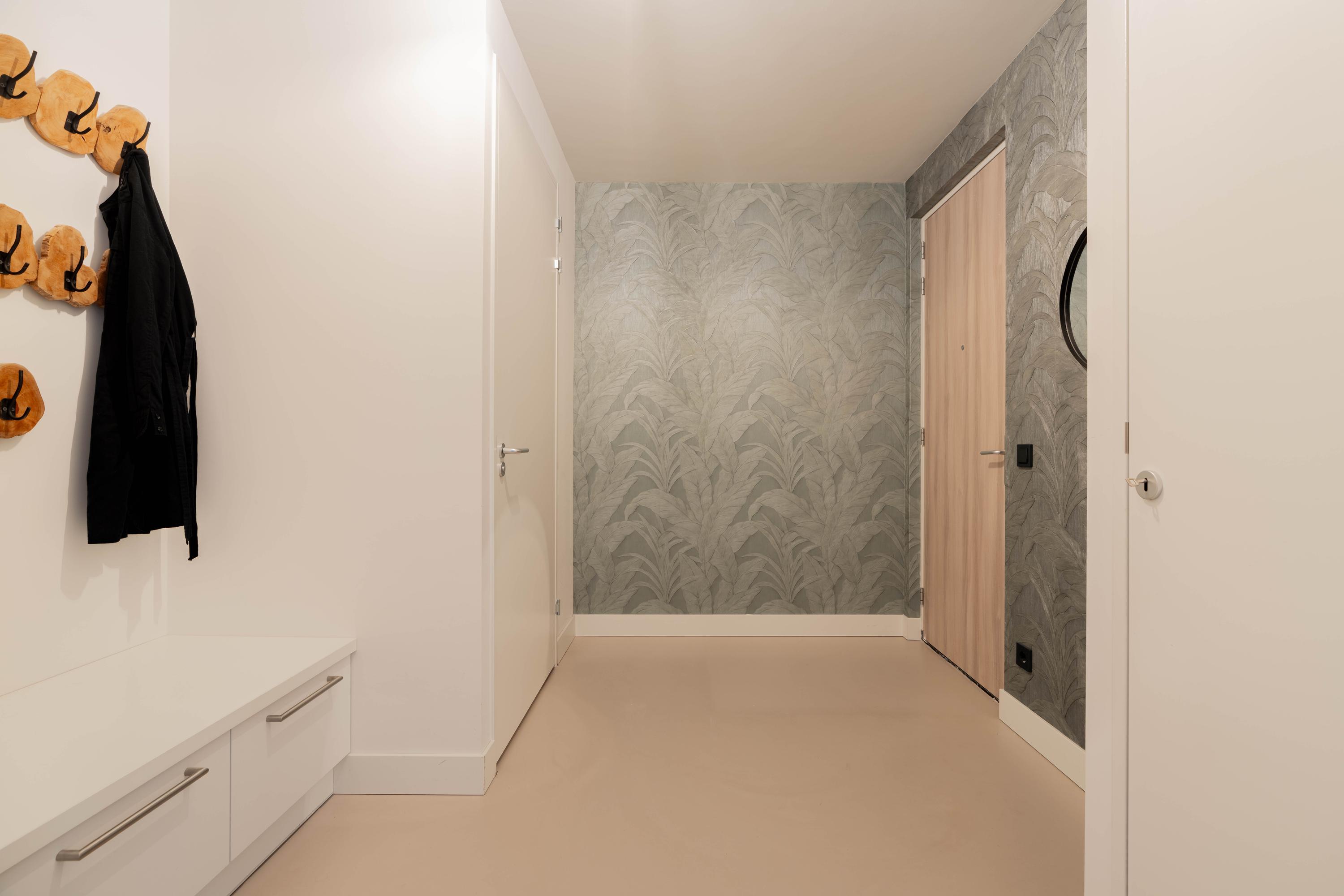 Via de lift of het trappenhuis bereik je de entree van de woning. De ruime hal biedt toegang tot een apart toilet en veel praktische opbergruimte. Direct valt de royale woonkamer op, met grote raampartijen die de ruimte in de ochtend en middag rijkelijk van natuurlijk licht voorzien. Aan de achterzijde bevindt zich de luxe, op maat gemaakte keuken met kookeiland en hoogwaardige inbouwapparatuur. De keuken en woonkamer worden subtiel met elkaar verbonden door een moderne bio-ethanol doorkijkhaard. Het appartement beschikt over drie goed bemeten slaapkamers die allen grenzen aan de hal met daartussen de luxe badkamer, voorzien van ligbad, inloopdouche, dubbele wastafel en een aparte wasruimte. Daarnaast vind je hier nog een separaat toilet en een ruime interne berging. Oorspronkelijk waren er twee badkamers; indien gewenst kan de ruimte eenvoudig opnieuw worden opgesplitst. Een vierde slaapkamer behoort eveneens tot de mogelijkheden (zie alternatieve plattegronden).