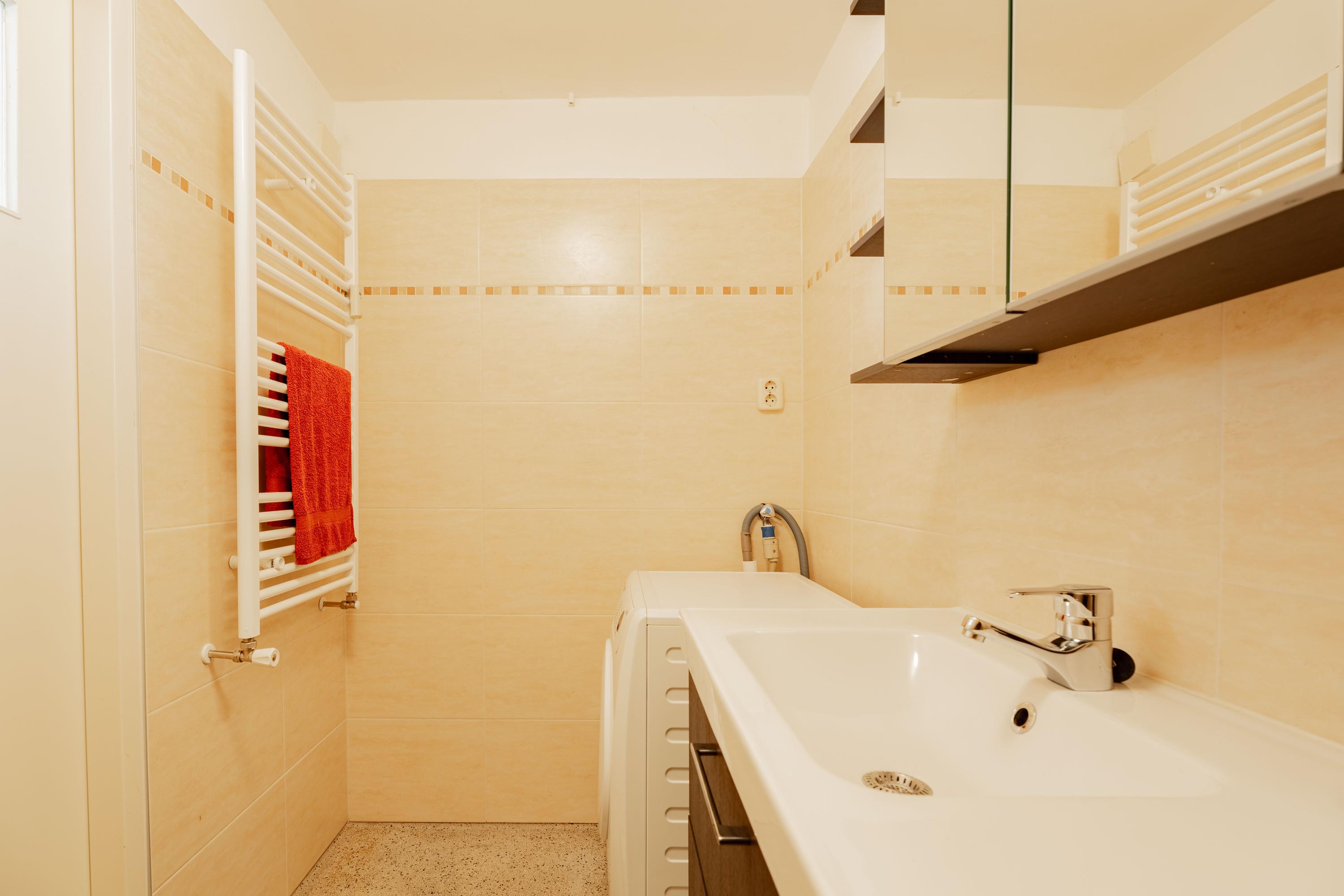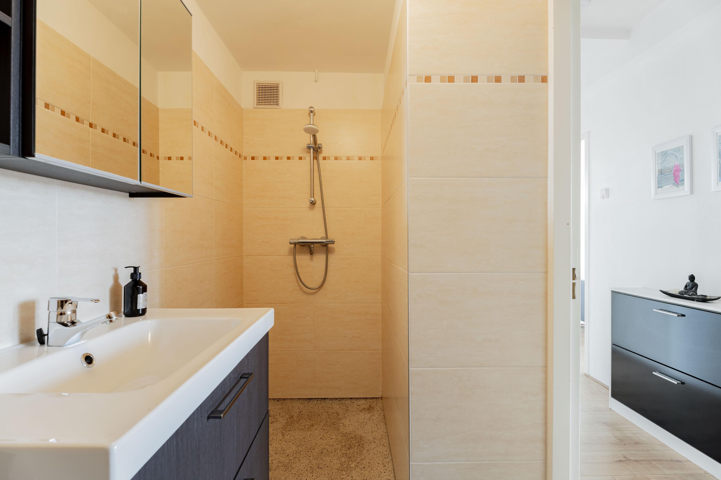 De badkamer is uitgerust met een wastafel(meubel) en een ruime inloopdouche. De afwerking en warme tinten zorgen voor een frisse, tijdloze uitstraling. Het toilet is een aparte ruimte, direct naast de badkamer gelegen.