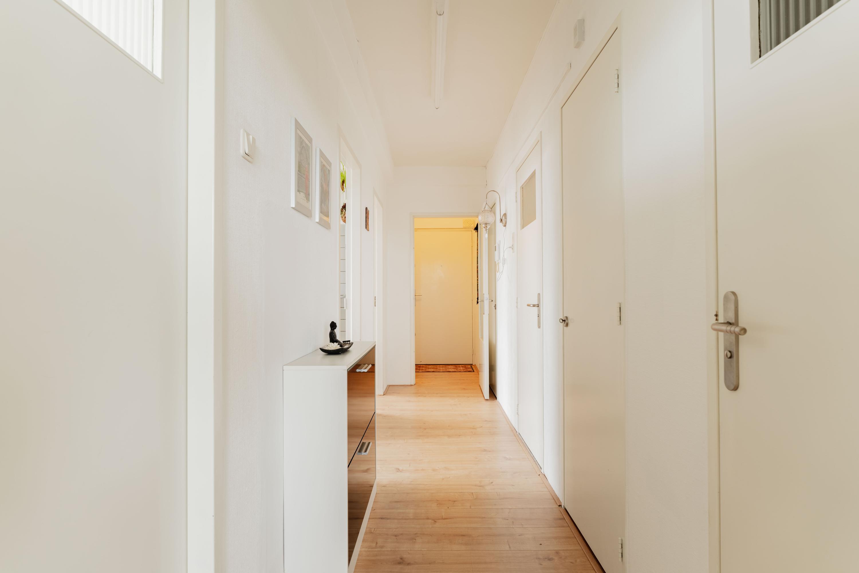 Entree met hal en toegang naar alle vertrekken. De woonkamer is voorzien van vele grote ramen die voorzien zijn van dubbelglas. Door de vele ramen geniet je optimaal van binnenvallend daglicht. Daarnaast is het bijbehorende uitzicht ook zeker niet onverdienstelijk. Door de speelse indeling van de ruimte is ook tevens een apart zit- en eetgedeelte te creëren. De woonkamer verleent tevens toegang tot het heerlijke balkon die op het oosten is gelegen met uniek vrij uitzicht!
