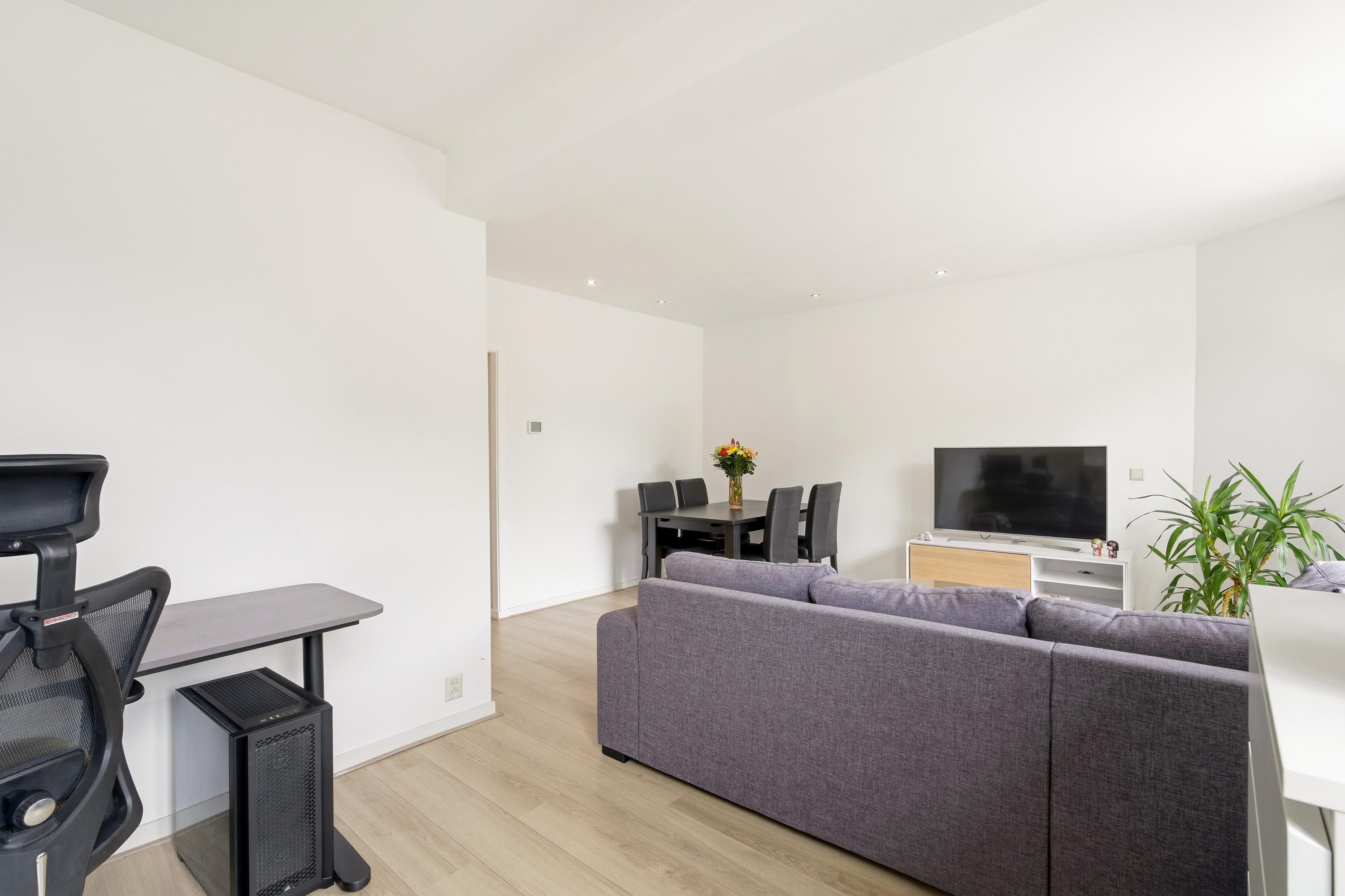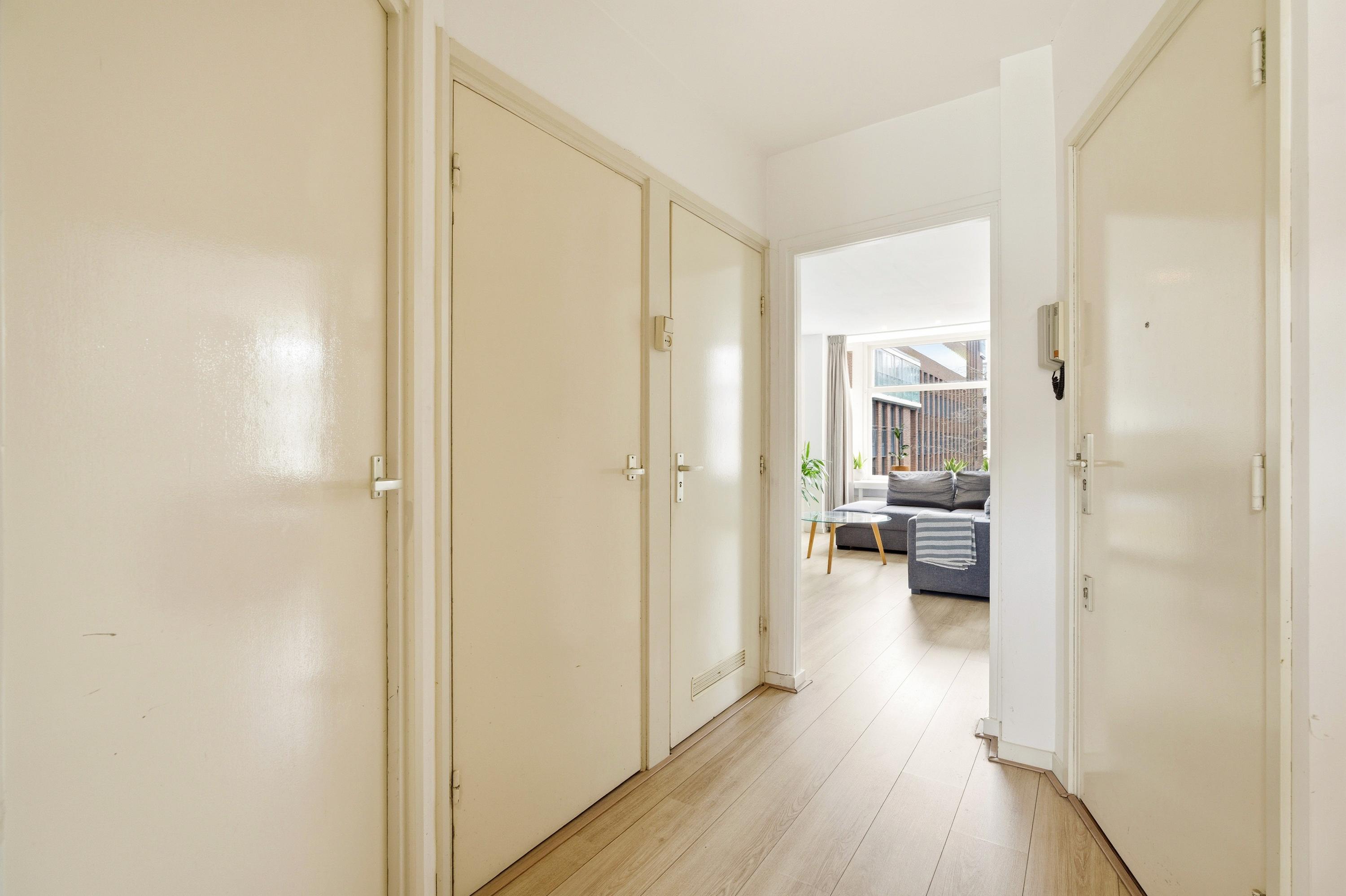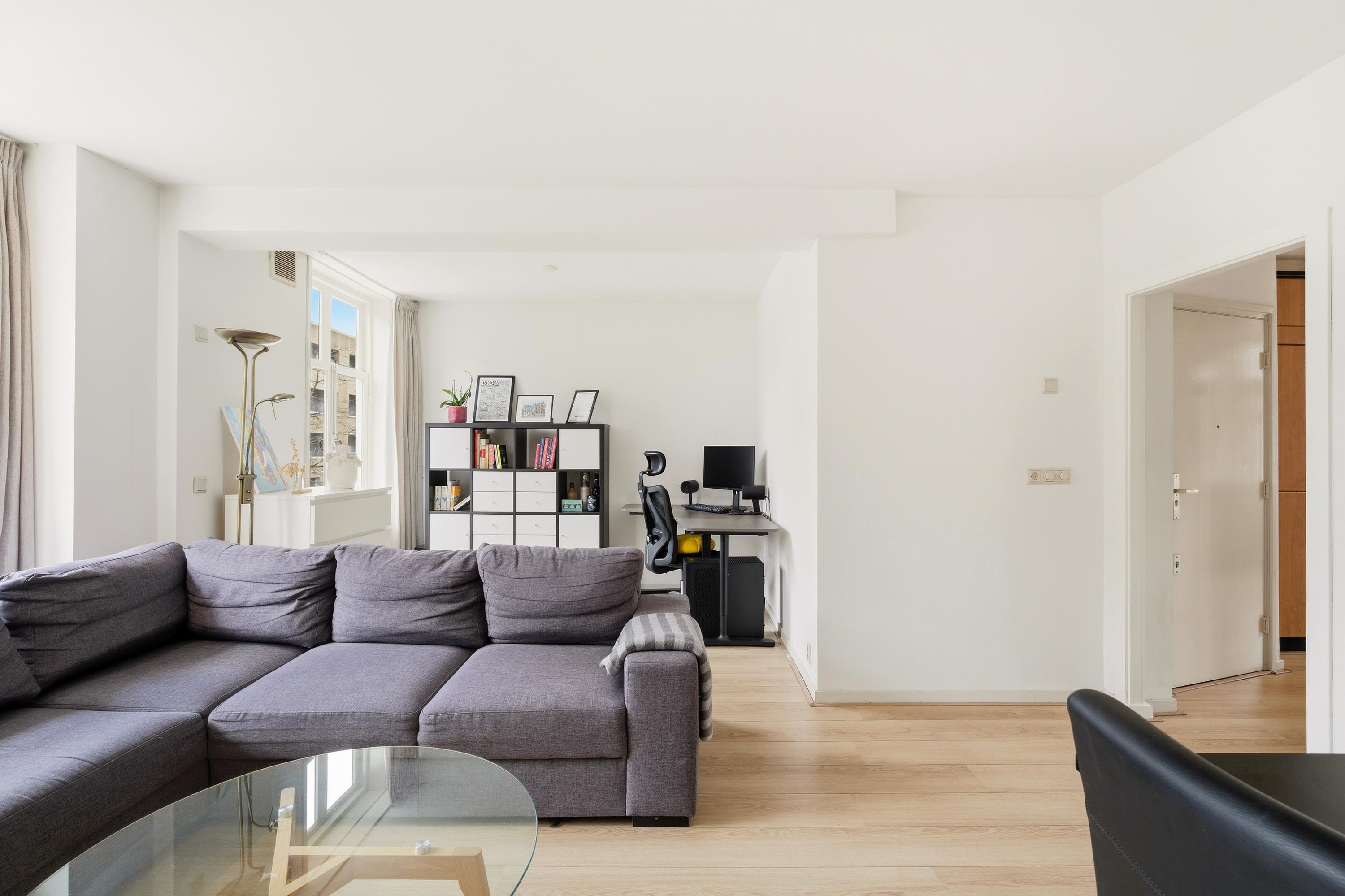 Via het gemeenschappelijke trappenhuis bereik je de woning op de tweede verdieping. De hal leidt naar de verschillende ruimtes van het appartement. Aan de voorzijde ligt de lichte woonkamer met grote ramen en vrij uitzicht over de straat. Hier is voldoende ruimte voor een comfortabele zithoek en een eettafel.