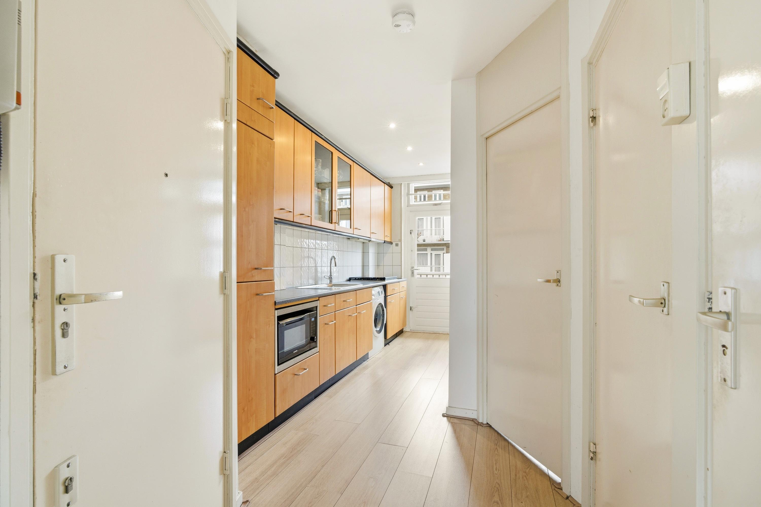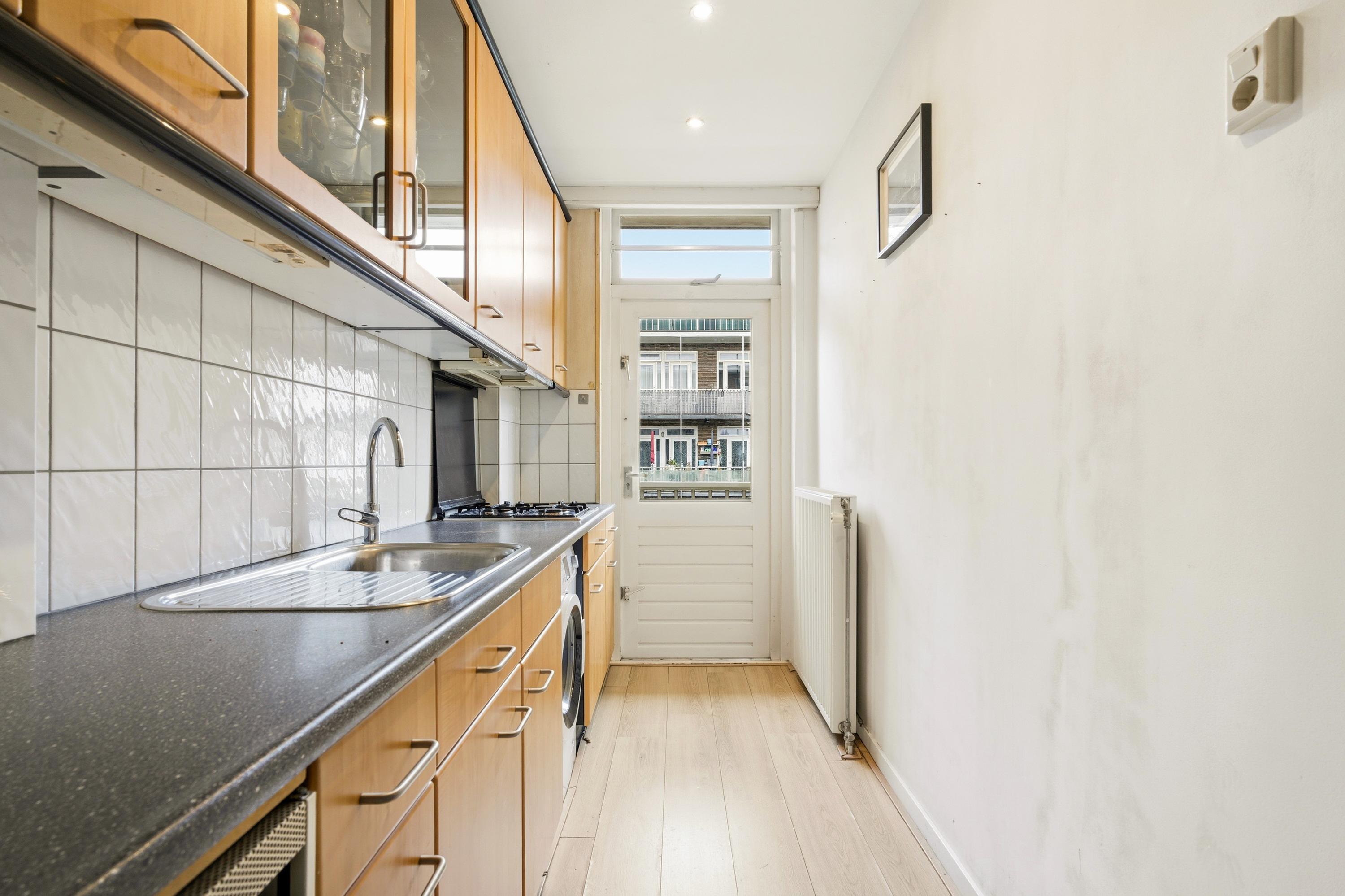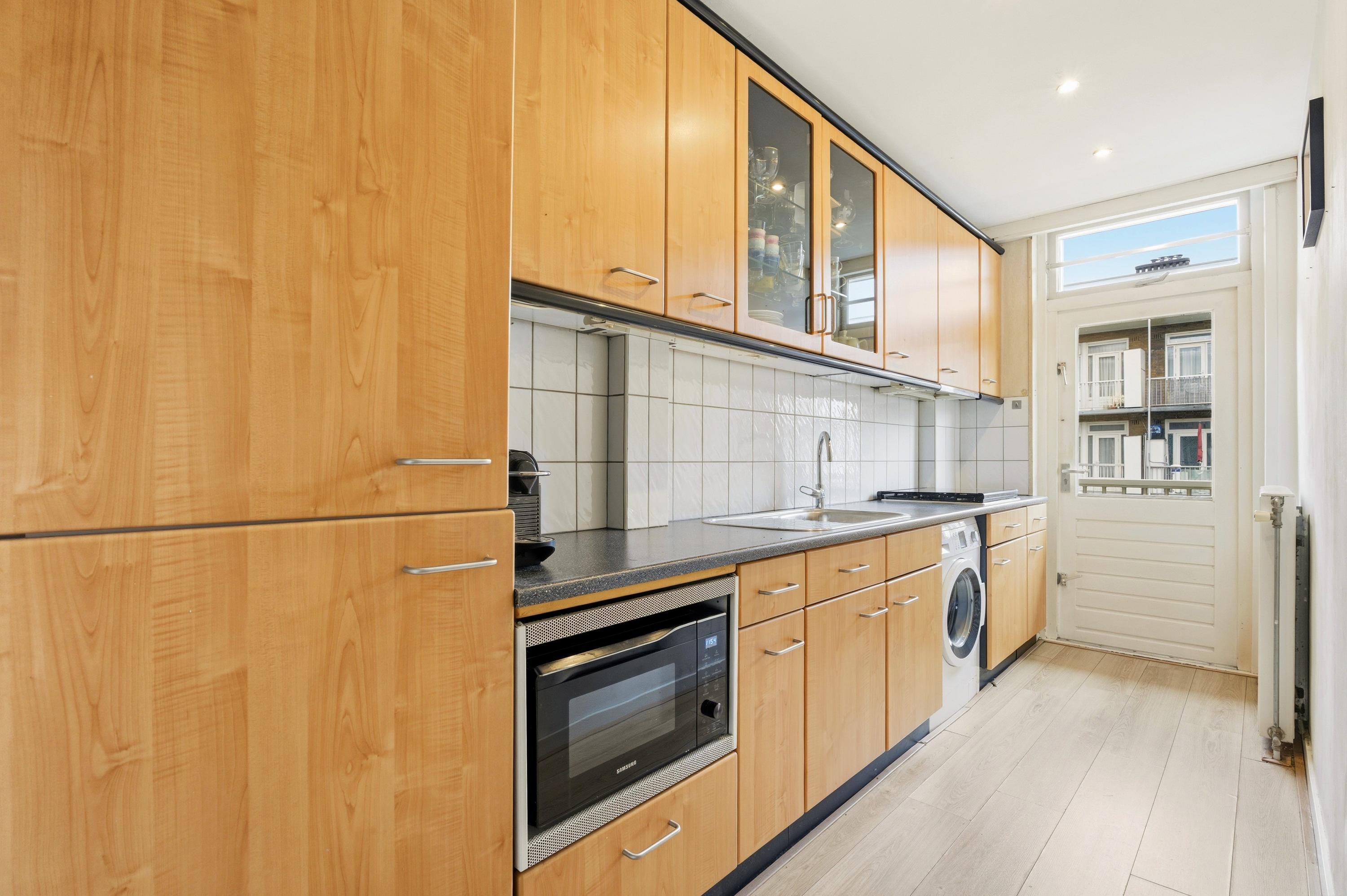 Aan de achterzijde van de woning ligt de keuken. De keuken is praktisch ingericht en heeft onder andere een gaskookplaat, oven magnetron combi en een afzuigkap. Ook is hier de aansluiting voor de wasmachine. Via de deur loop je naar het balkon aan de achterzijde, waar je rustig zit met uitzicht over de groene binnentuinen.