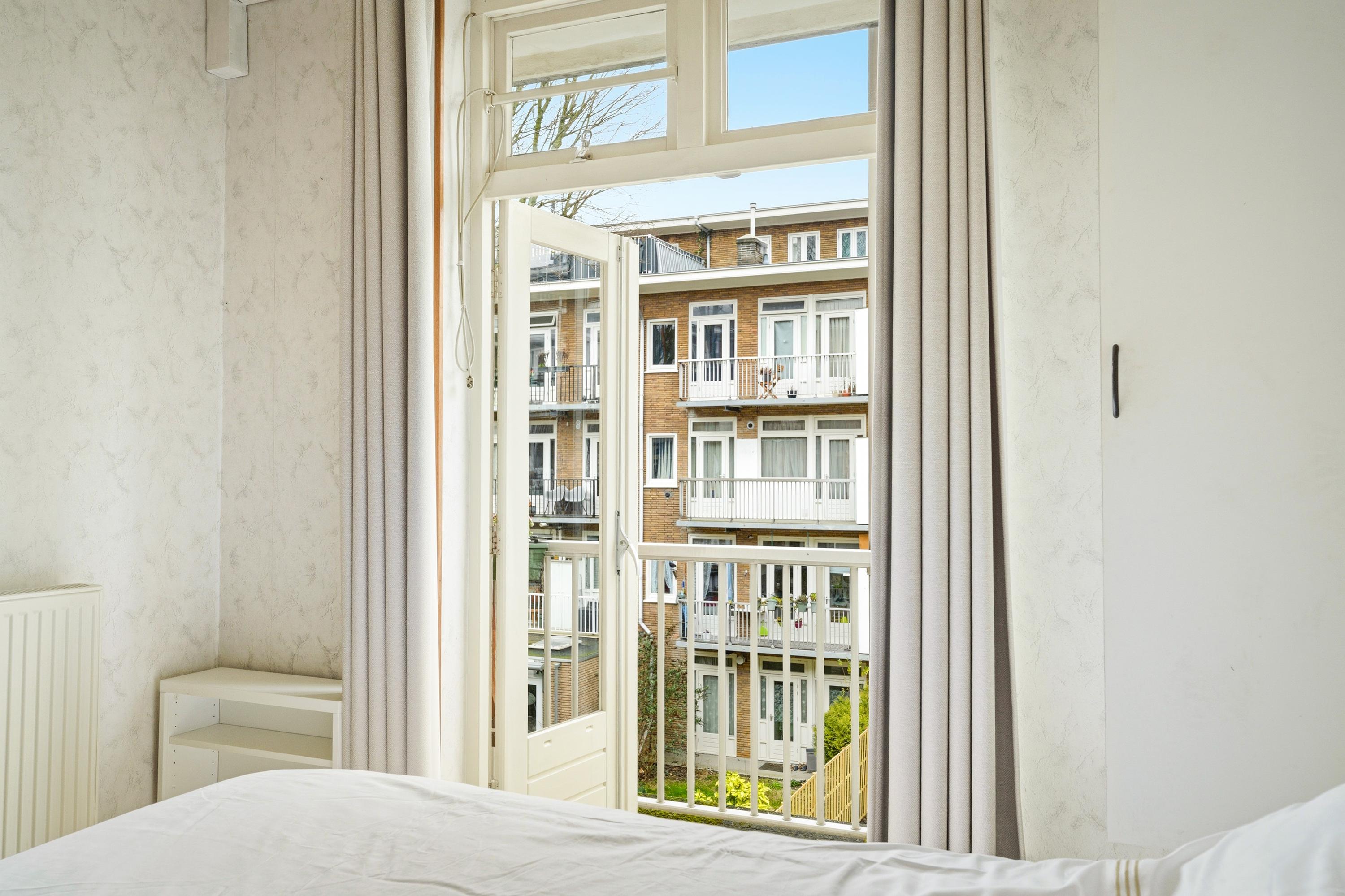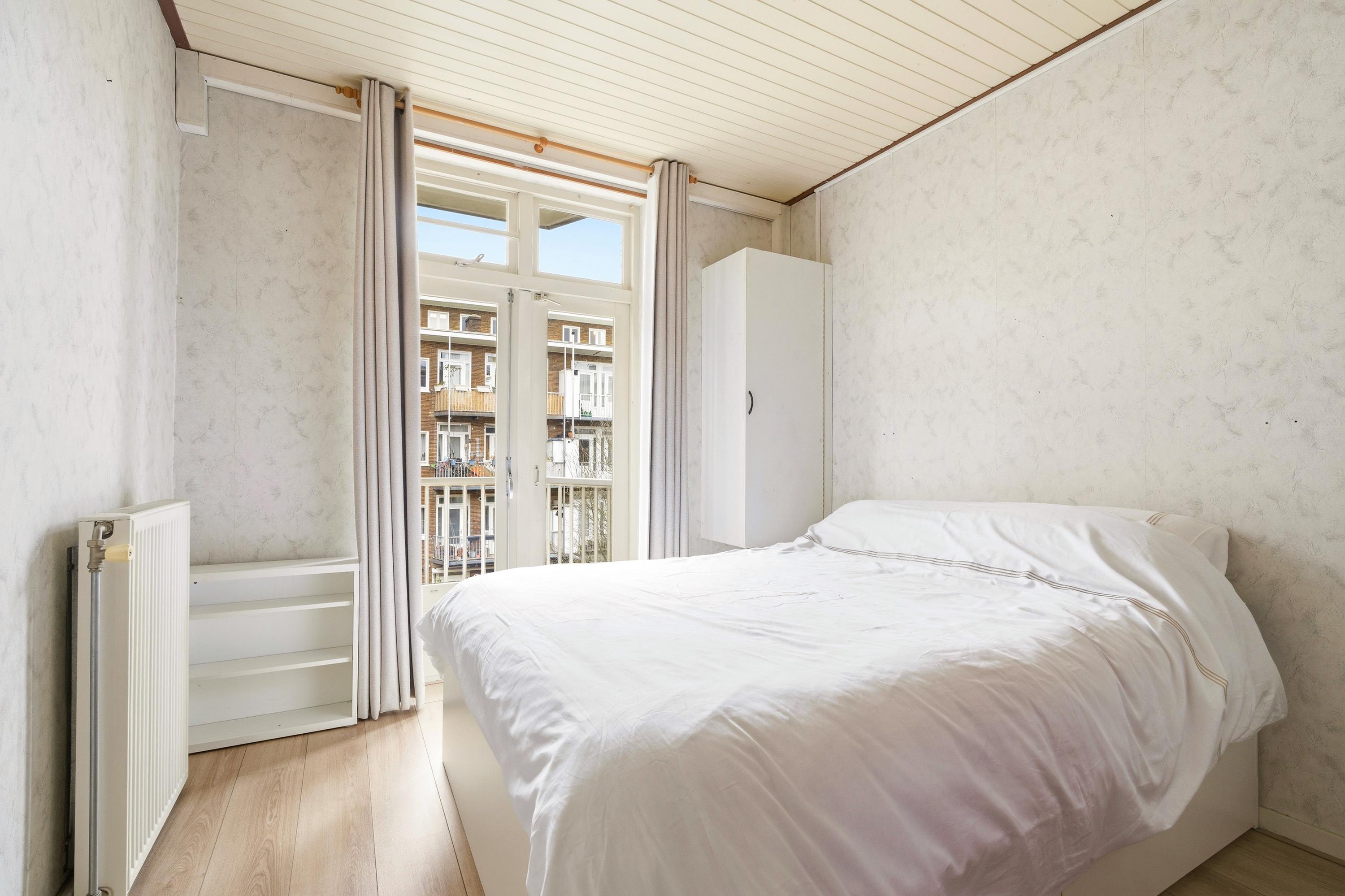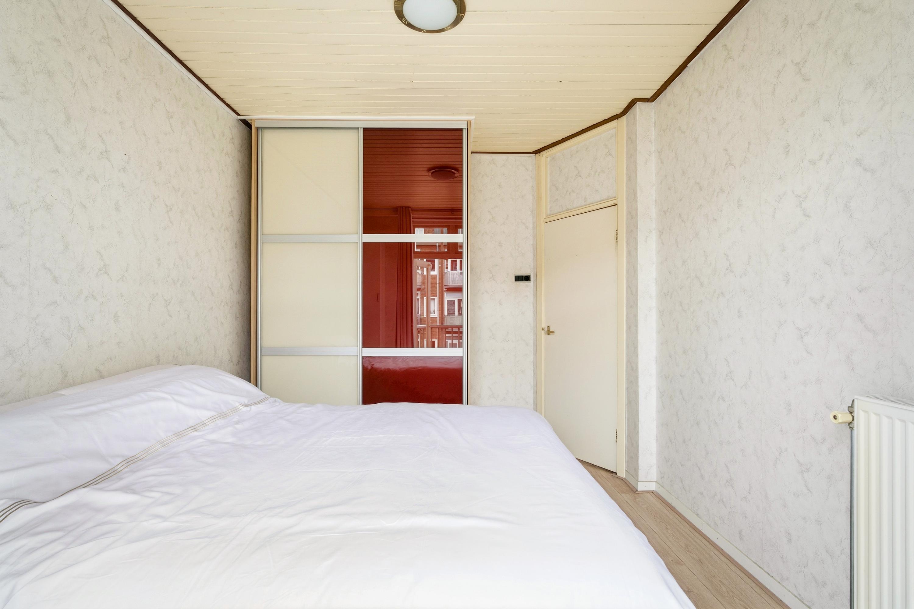 De slaapkamer ligt eveneens aan de achterzijde met een inbouwkast en heeft openslaande deuren naar het balkon. Dit is een ruime en rustige kamer met voldoende plek voor een tweepersoonsbed en een kledingkast.