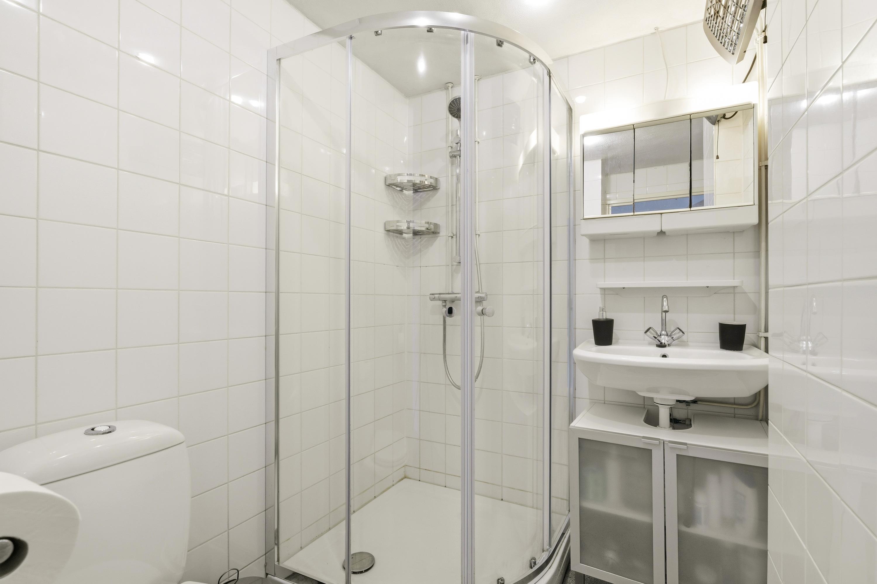 De badkamer is verzorgd en heeft een douche, toilet en een wastafel met meubel en spiegelkast.